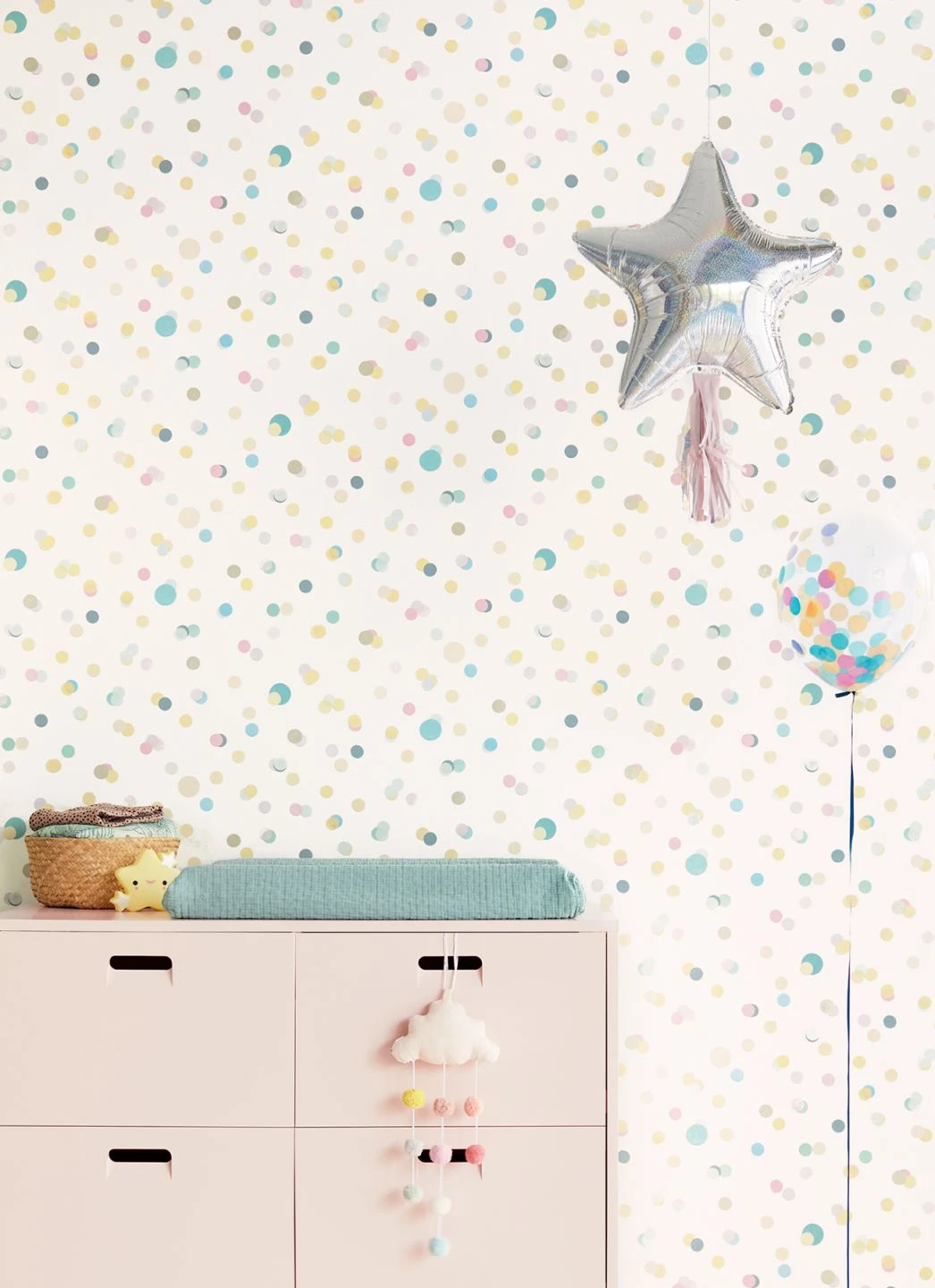 Die bunten Punkte in Hellgelb, Pastellgrün, Perlbeige, Türkisblau machen einfach nur Spaß und gute Laune. Das Kinderzimmer läuft zu Hochtouren auf und beflügelt die kreative Energie zum Lernen und Spielen. Dazu punktet die Kindertapete für Jungs und Mädchen mit waschbeständiger Oberfläche, die leicht zu reinigen ist.