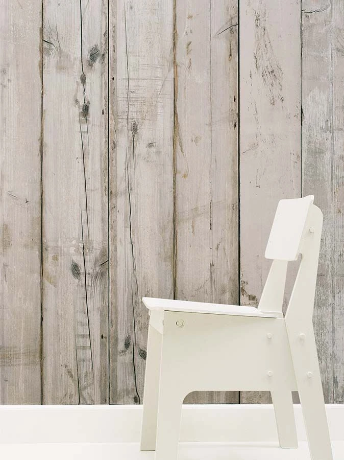 Die Holz-Imitation der exklusiven Designertapete aus dem Hause NLXL lebt von der Ästhetik der Unvollkommenheit. Hellgrau lasierte Holzbretter lassen Astlöcher, Risse, Spuren der Bearbeitung und die durchschimmernde Maserung erkennen. Ehrlich und ungeschönt ist die Wirkung, die von dieser Vliestapete ausgeht. Die raue Romantik einer Holzwand ergänzt den Shabby Chic zur bewusst imperfekten Perfektion.