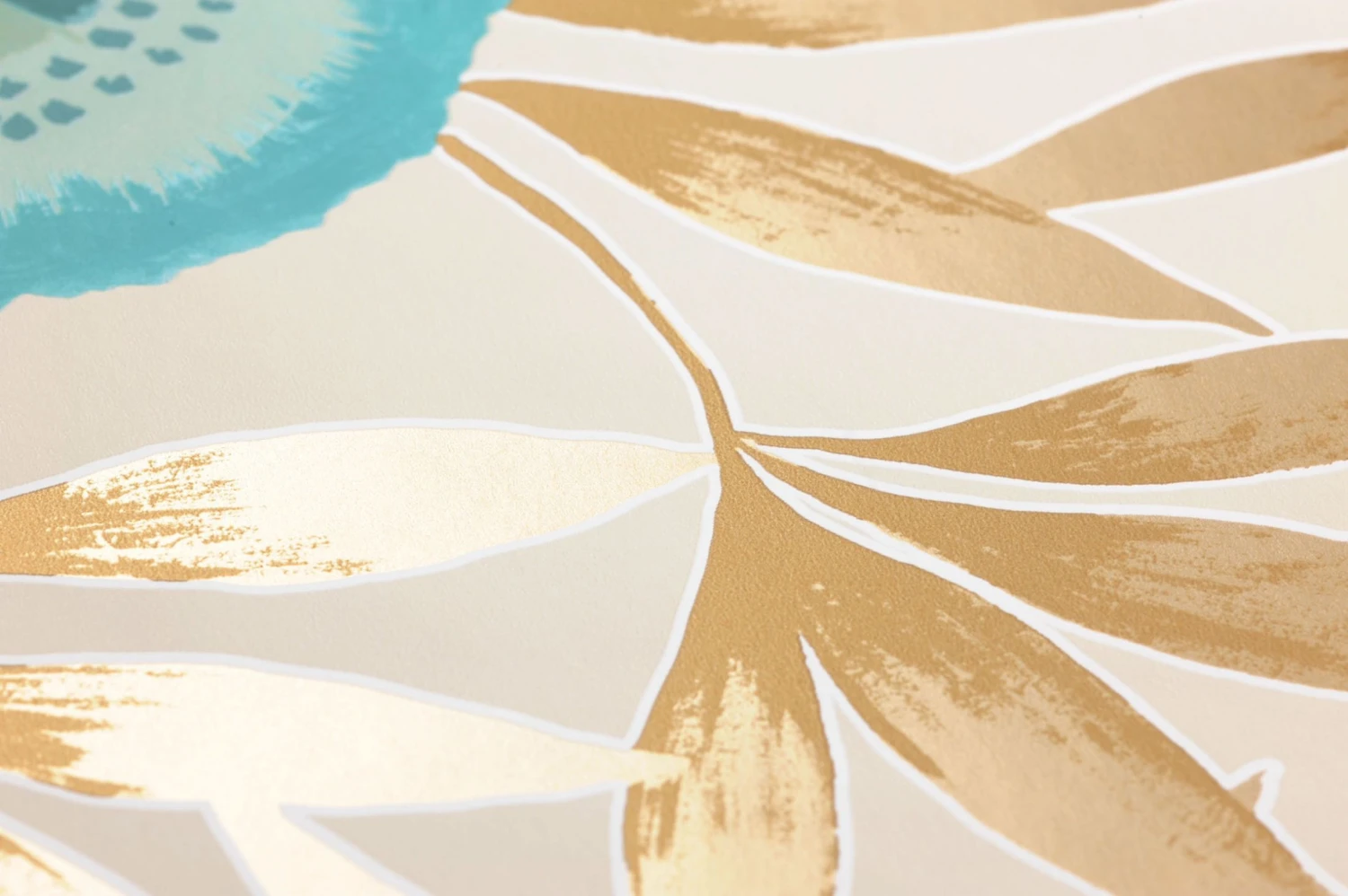 Cremeweiß sorgt für einen unwiderstehlichen Goldglanz und bringt die Spritzigkeit der Aquatöne auf den Punkt. Das stilisierte Blüten-Blätter-Arrangement beweist glamouröse Romantik in einer sehr modernen Form. Die waschbeständige Oberfläche erlaubt eine feuchte Reinigung.