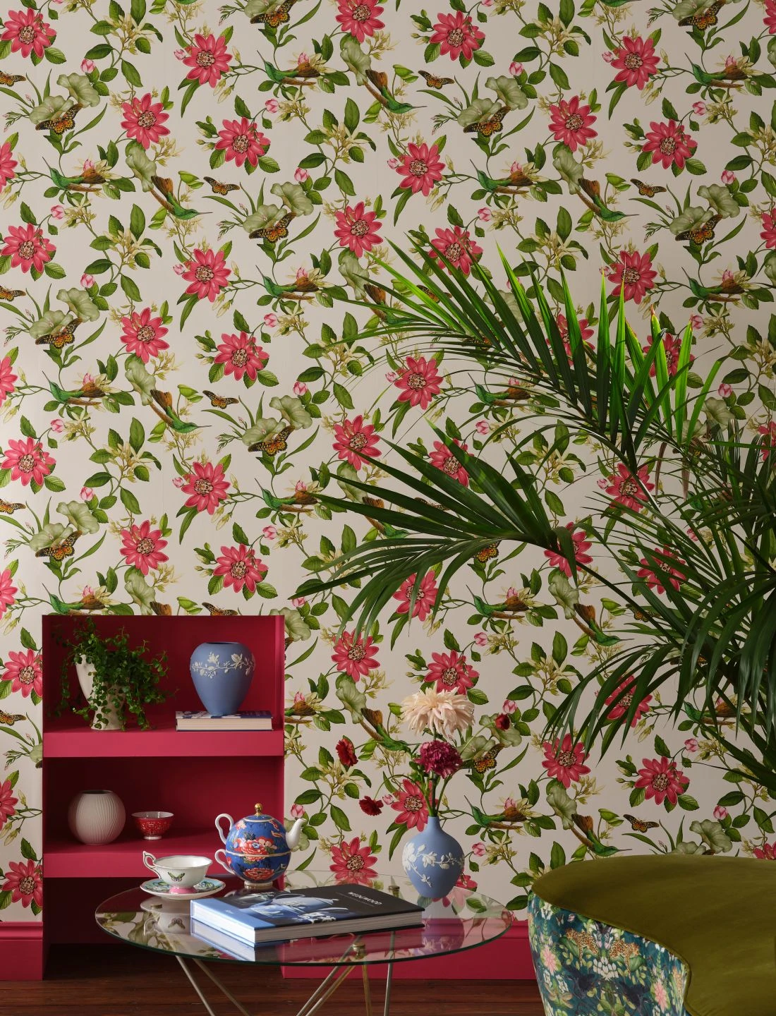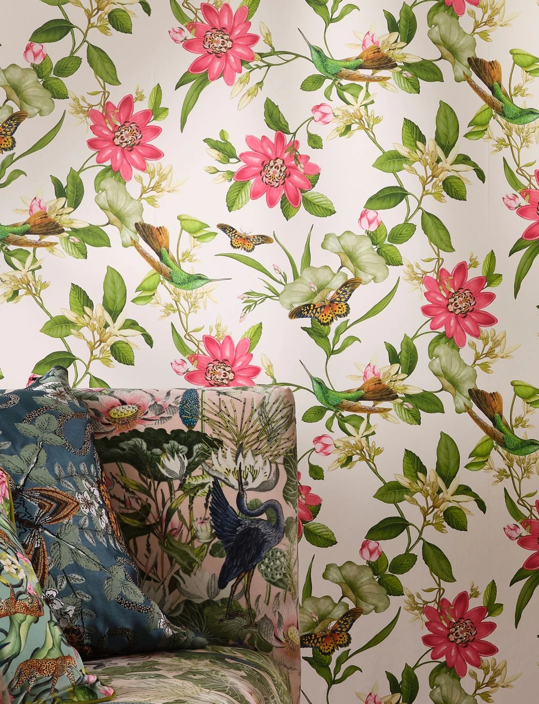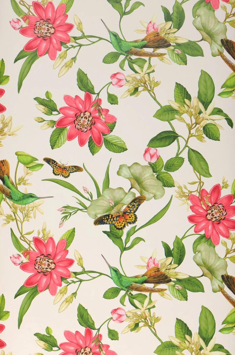 Die Kolibris auf den Blütenranken sind fast perfekt getarnt mit ihrem smaragdgrünen Federkleid und den grünbraunen Flügelspitzen und Schwanzfedern. In Pink und Weiß blühen exotische Pflanzen. Und dazwischen flattern Schmetterlinge mit hübsch orangefarben, schwarz und weiß gemusterten Flügeln. Die subtropische Welt, die Vliestapete Sensu an Ihre Wände zaubert, macht aus Ihrem Raum einen Ort voller Licht und Wärme.