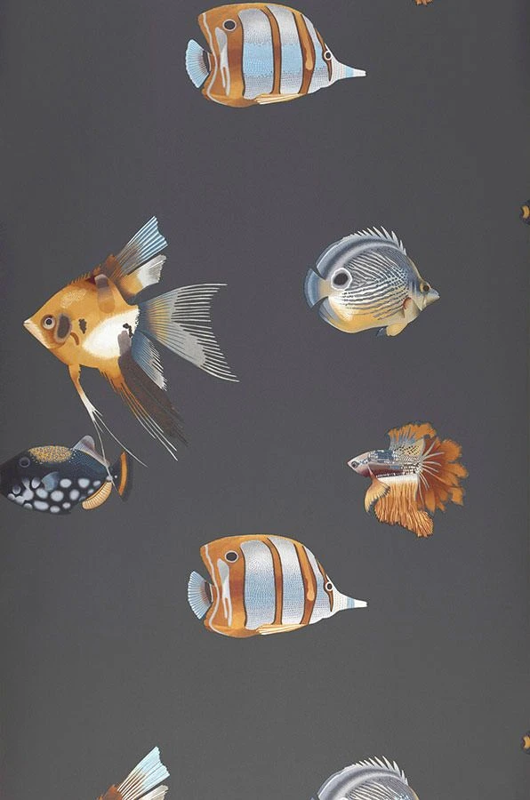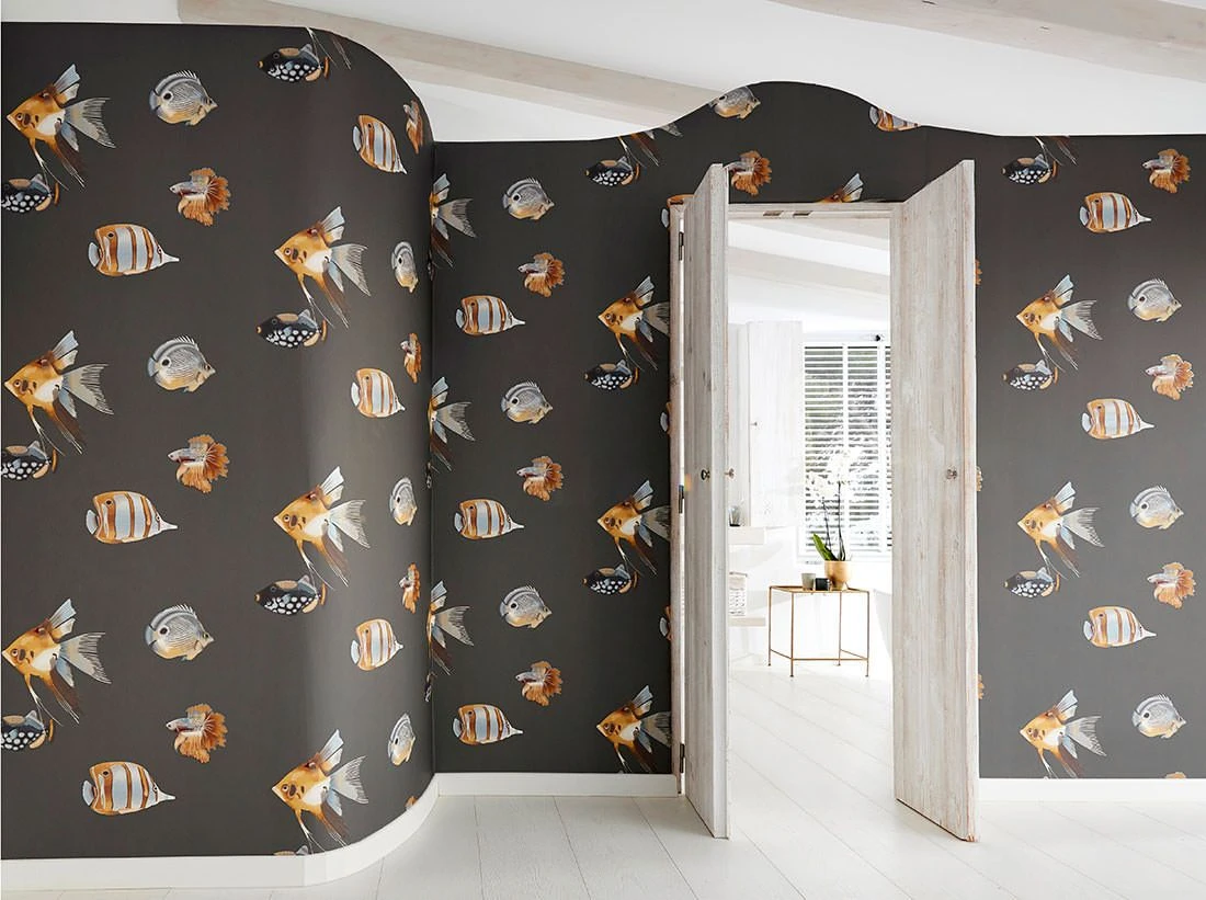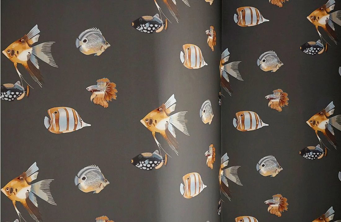 Mit dieser Designer Tapete schwimmen Sie garantiert gegen den Strom, so wie es beim genauen Hinsehen auch einige der effektvollen Musterfische tun. Das Dunkelgrau der Grundfarbe betont die bis ins kleinste Detail abgebildeten Fische in einem Musterfarbenmix aus Anthrazitgrau, Ockerbraun, Perlblau, Rotbraun und Lehmbraun.