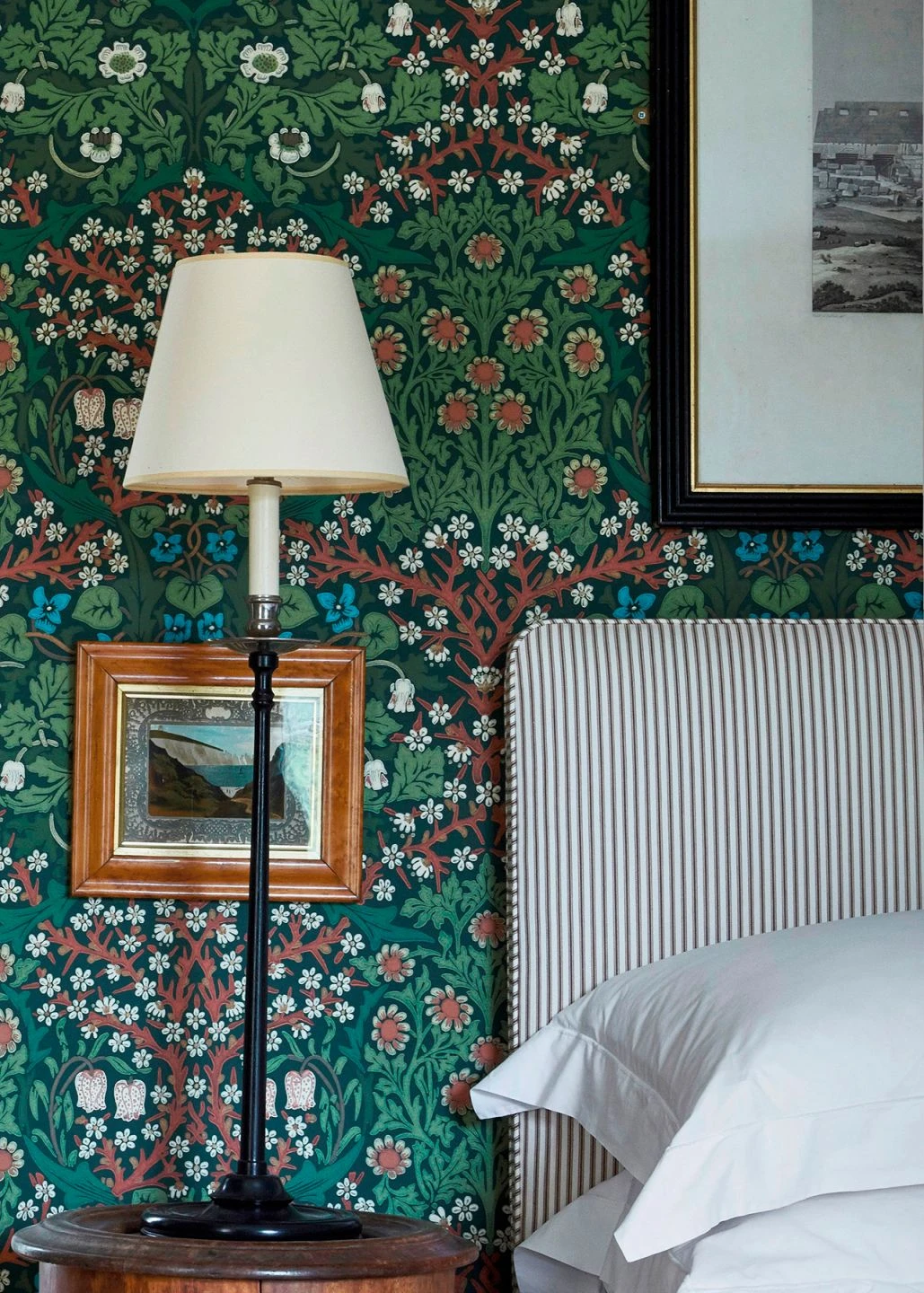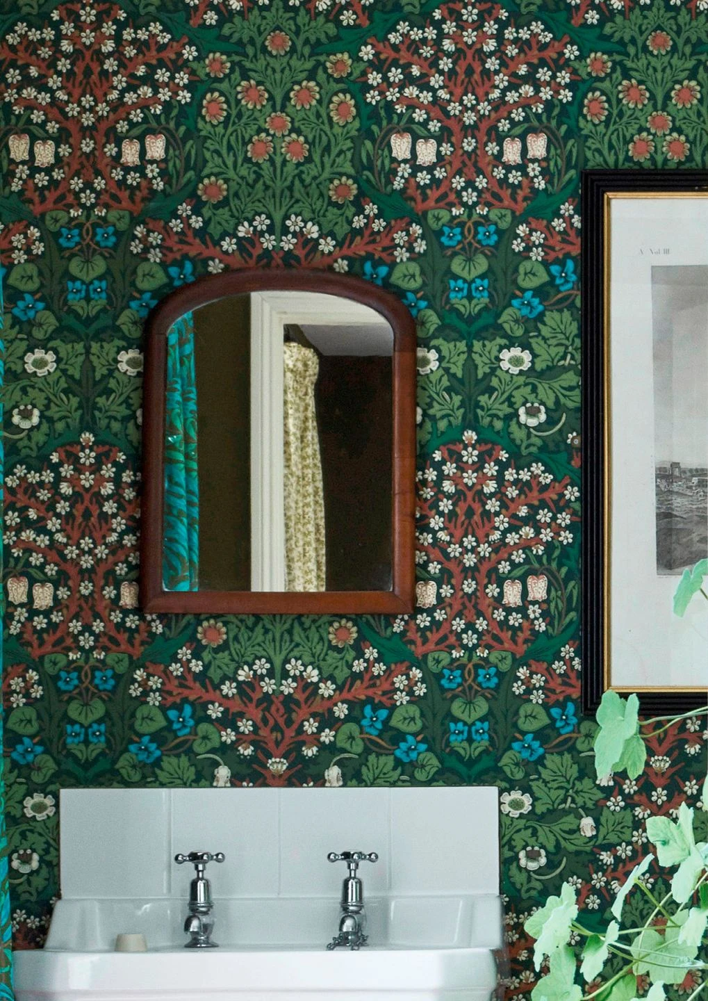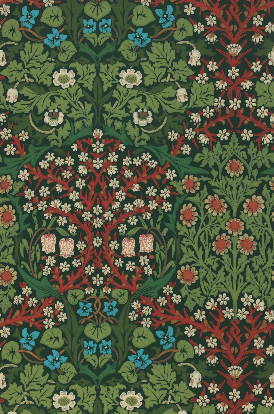 In der Vielfalt der Blüten und Blattranken kommt eine verborgene Symmetrie zum Vorschein, die der scheinbaren Willkürlichkeit der Anordnung eine Ordnung verleiht. Das Rot, Pastellblau und immer wieder auftauchendes Hellgelb bilden eine Einheit mit den verschiedenen Grüntönen der Blätter und dem schwarzgrünen Grund. Das Leimdruckverfahren steuert einen handgearbeiteten Eindruck bei, der bestens mit einer Einrichtung im Retro-Stil harmoniert.