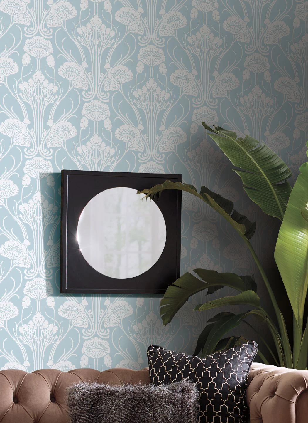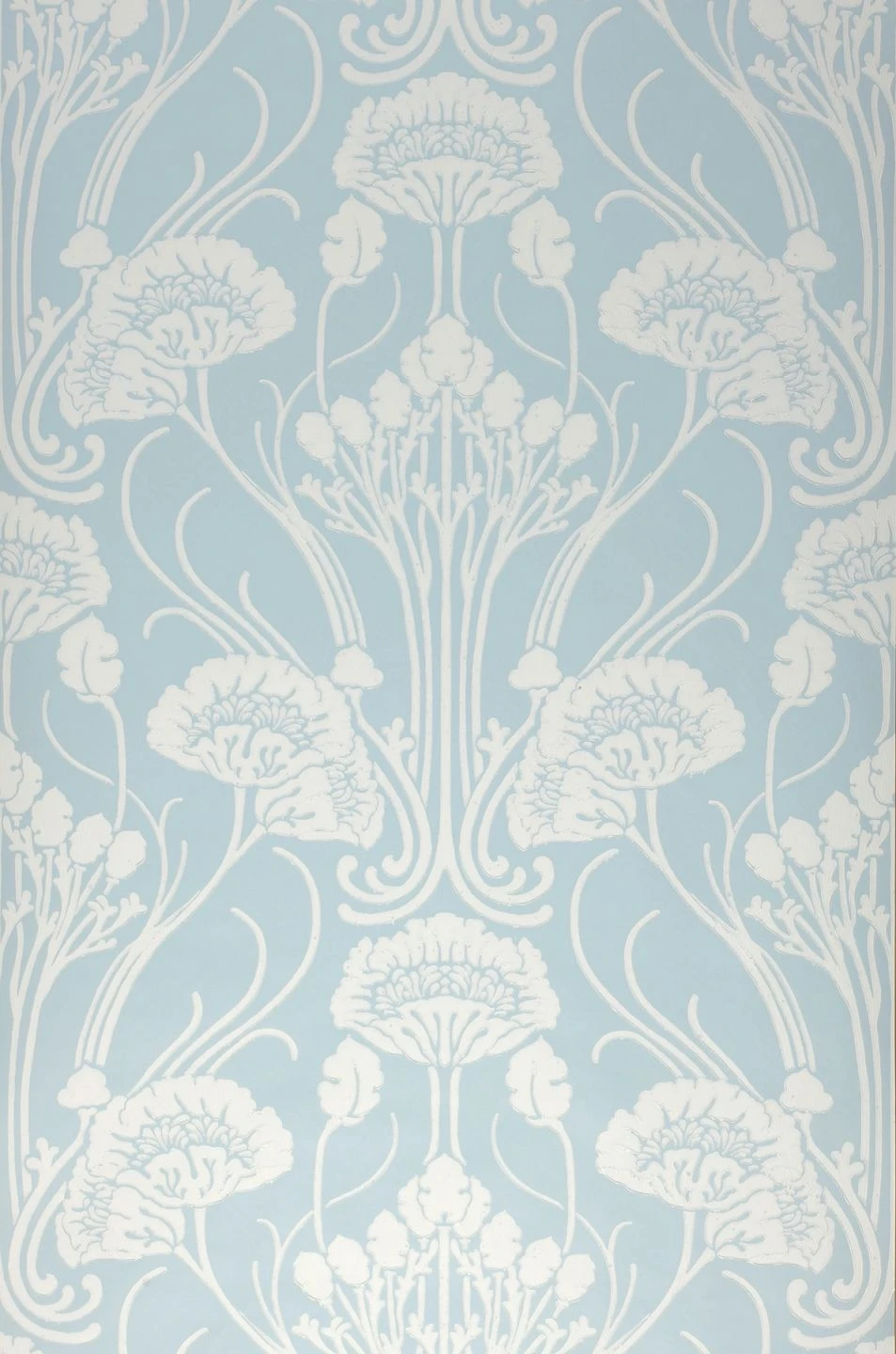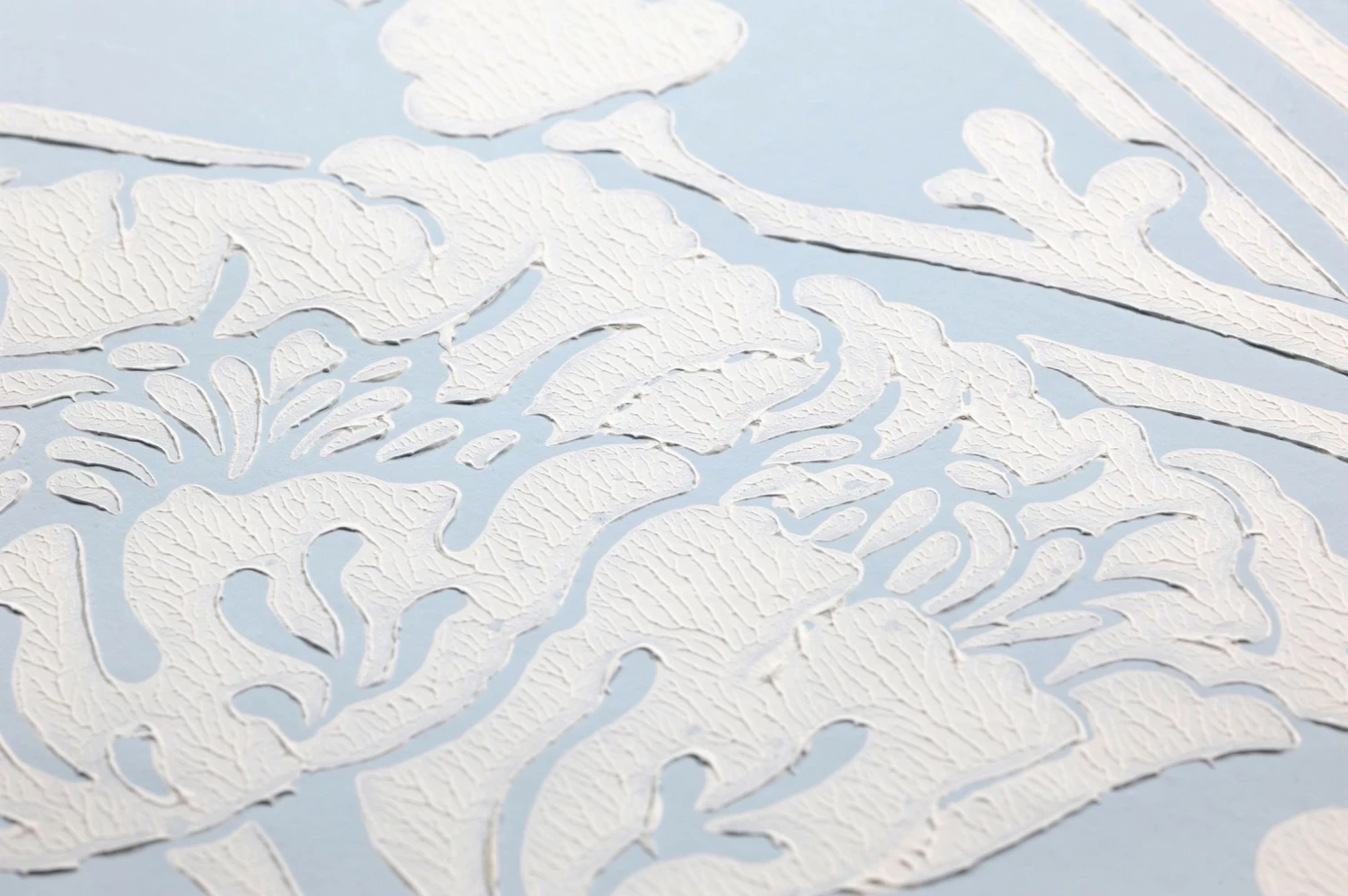 Unverkennbar ist der Einfluss des Jugendstils auf die im Leimdruckverfahren hergestellte Vliestapete. Das cremeweiße Muster besteht aus typischen stilisierten Blüten, Blättern und Früchten, die sich an zarten geschwungenen Stielen über den hellblauen Grund ranken. Durch den Farbauftrag der Musterelemente entsteht eine deutlich fühlbare, leicht erhabene Struktur und betont im Zusammenspiel von Licht und Schatten die Formen der Ornamente.