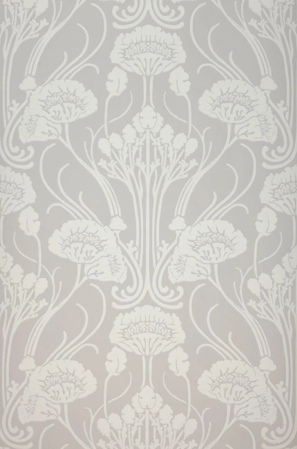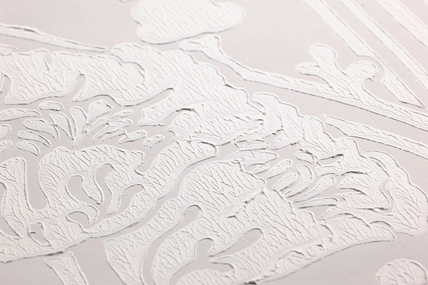 Aus der Struktur des Leimdrucks mehr noch als aus der Dynamik des Farbkontrastes zieht das Muster dieser Vliestapete seine Kraft. Die typischen stilisierten Blütenpflanzen des Jugendstils mit ihren ineinander verschlungenen Blättern und Stängeln sind in Cremeweiß auf zart hellgrauem Grund gehalten. Durch den Farbauftrag im Leimdruckverfahren erhalten sie eine fühlbar erhabene Struktur und entwickeln ihre besondere Wirkung im Wechselspiel von Licht und Schatten.