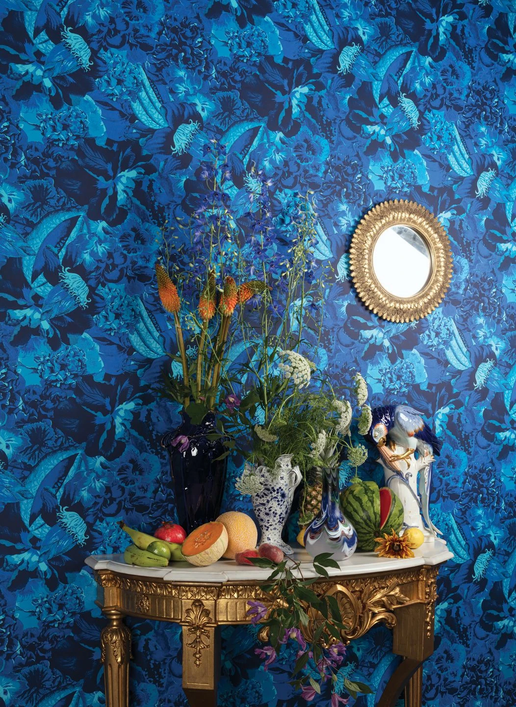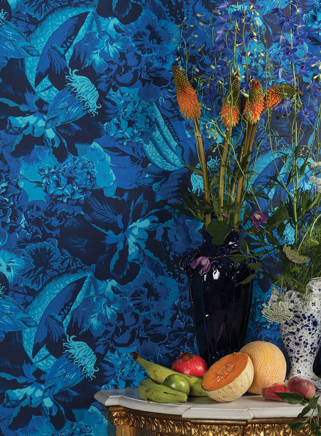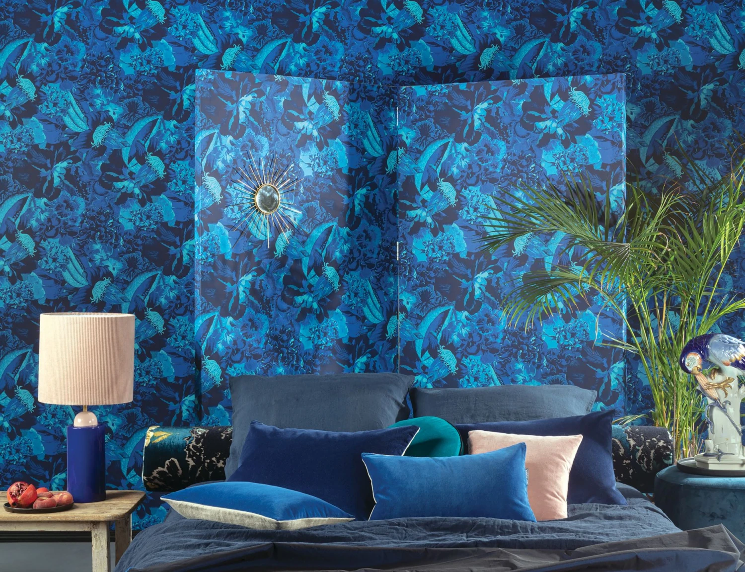 Blumentapete einmal anders: Die raumgreifenden Blüten und Blätter sind ganz in Blautöne getaucht. Die verschiedenen Helligkeitsstufen von einem zarten Hellblau bis zum tiefen Nachtblau enthüllen die feinen Details der Blütenblätter. Eine traumhafte Stimmung entsteht, die Ihren Raum fast magisch erscheinen lässt. Je nachdem, womit Sie das blaue Blütenmeer kombinieren, erzielen Sie ganz unterschiedliche Raumwirkungen.
