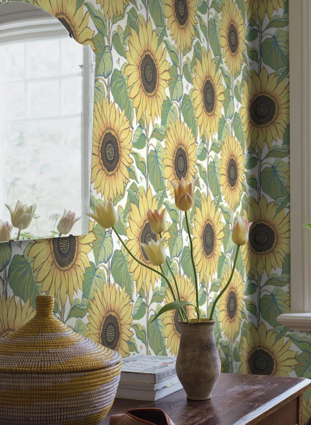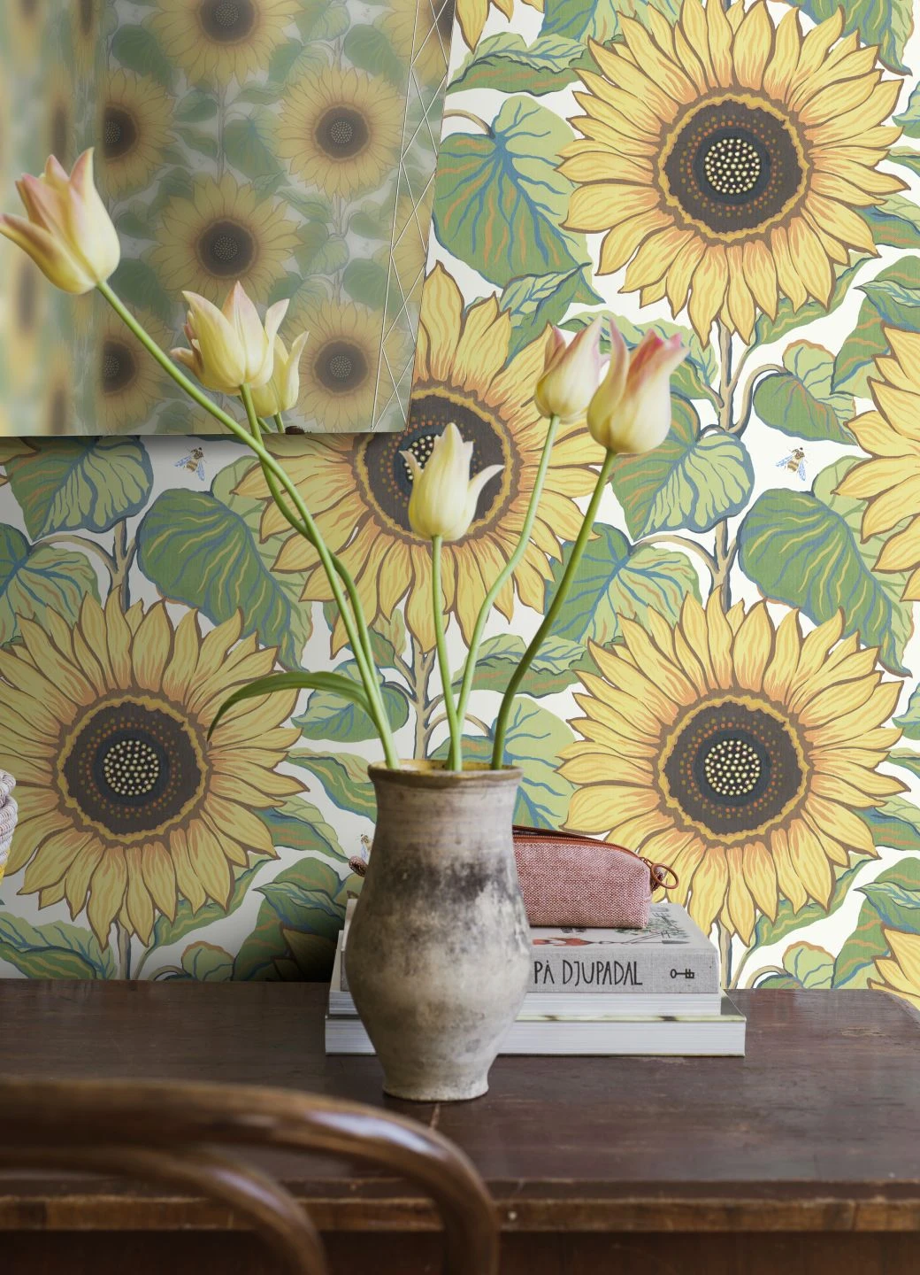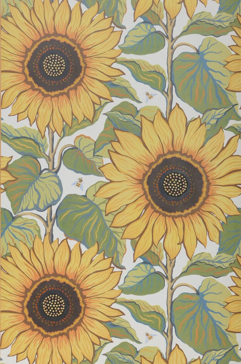 Welche Blume symbolisiert die lebensspendende Kraft des Sommers mehr als die Sonnenblume? Dicht an dicht bedecken die großen, strahlenden Blüten, schön gezeichnet in Gelb mit Beige-, Braun und Orangetönen, den weißen Untergrund. Auch die Blätter sind ein echter Hingucker mit ihren Adern in Gelb und Blau. Interessante Details bieten die Insekten, die zwischen den großen Blumen hin und her schwirren. Mit Siwa holen Sie den Sonnenschein in Ihr Zuhause.