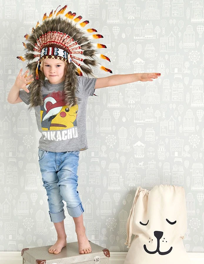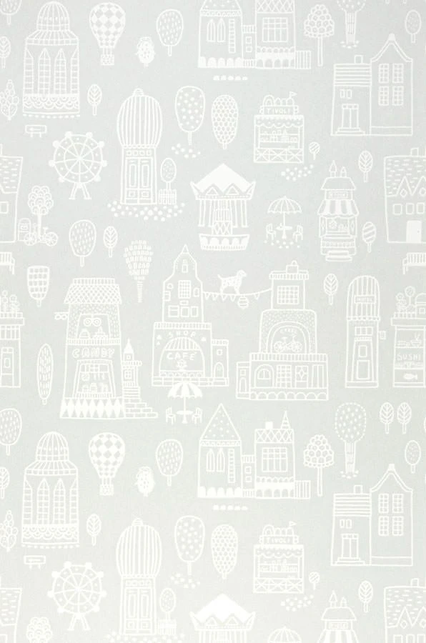 Themenwelten für Kinder bestimmen die Handschrift des Tapetenlabels Majvillan. Die kleine Stadt mit kindgerecht grafisch umgesetzten Häusern, Gebäuden, Bäumen ist auf der grau-weißen Farbvariante mit Elementen vom Jahrmarkt gespickt. Karussell, Riesenrad, Heißluftballon verwandeln die Stadt in eine Erlebnisstadt.