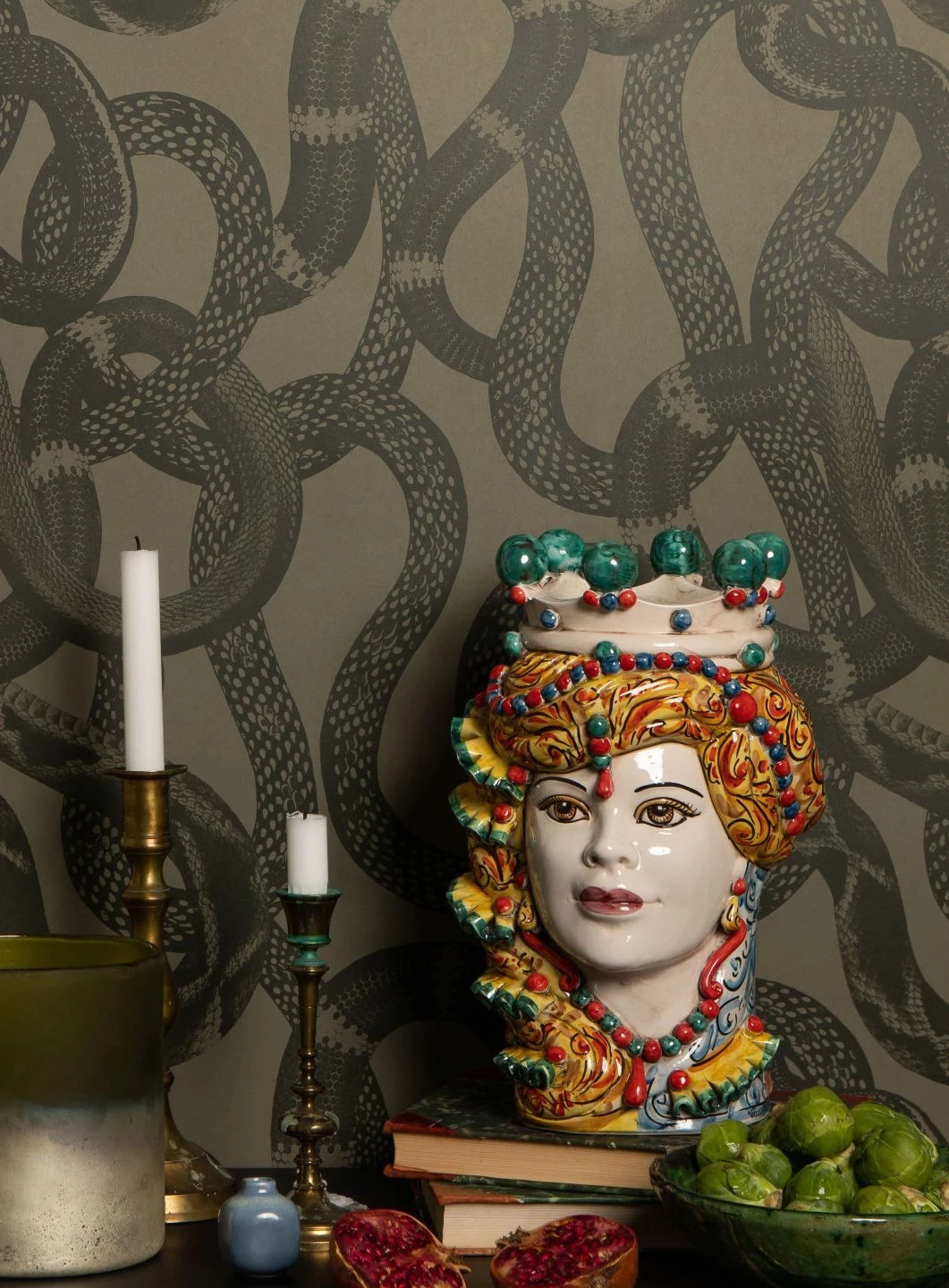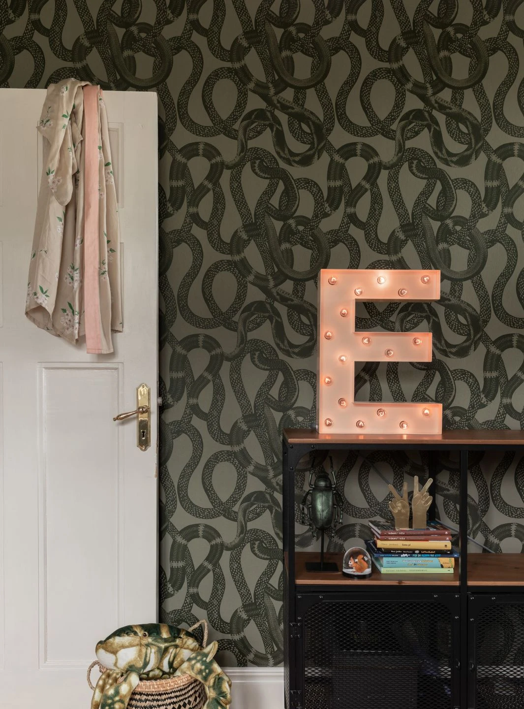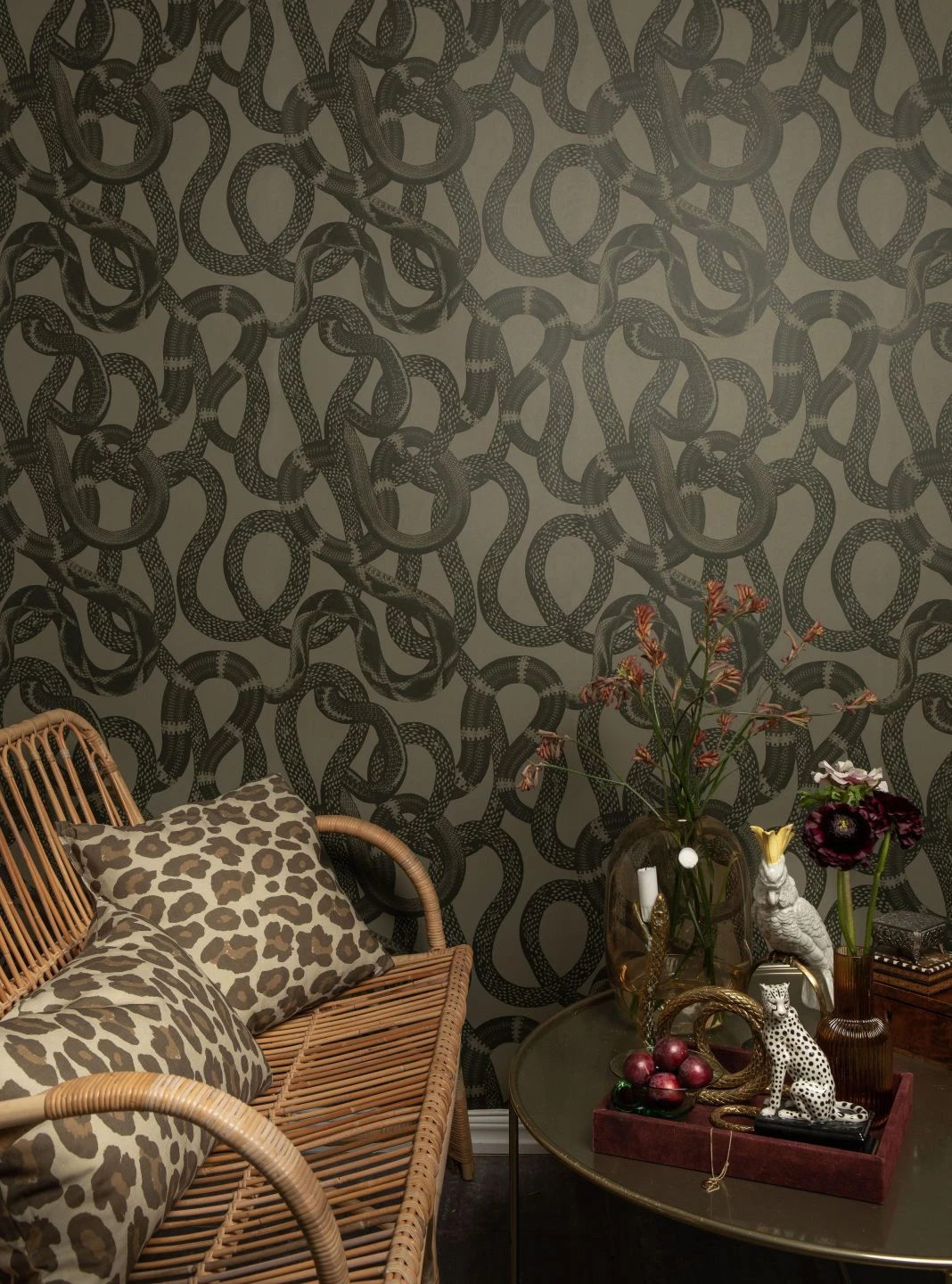 Schlangen in ihrer ganzen Faszination sind das Thema dieser Vliestapete der schwedischen Designerin Lisa Bengtsson. Die vielleicht am meisten verkannten Tiere schlängeln sich auf und ab an Ihren Wänden. Beinahe getarnt durch die schwarzen Illustrationen auf dem moosgrauen Grund, kommen dennoch die schuppige Struktur ihrer Haut und die unterschiedliche Zeichnung der Reptilien zum Ausdruck. Die ausgefallene Tapete verträgt Ton-in-Ton-Deko ebenso gut wie farbliche Elemente als Gegenpol.