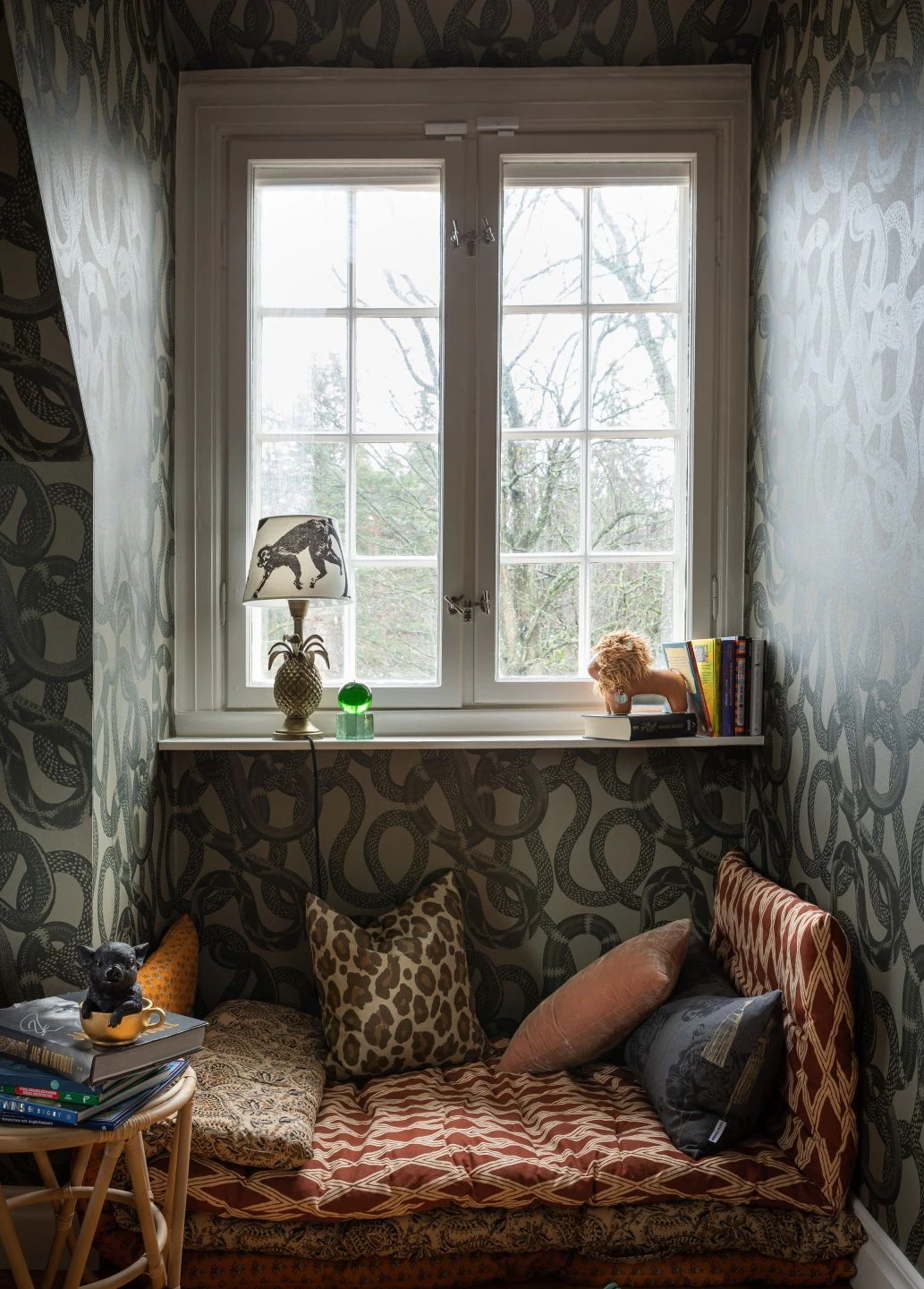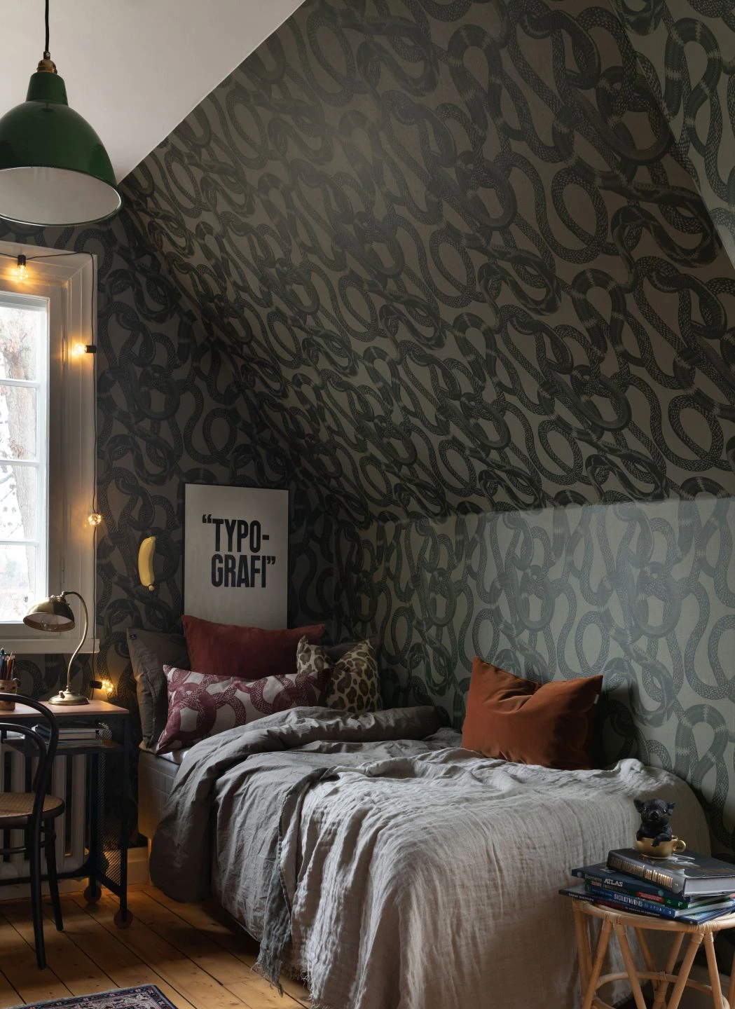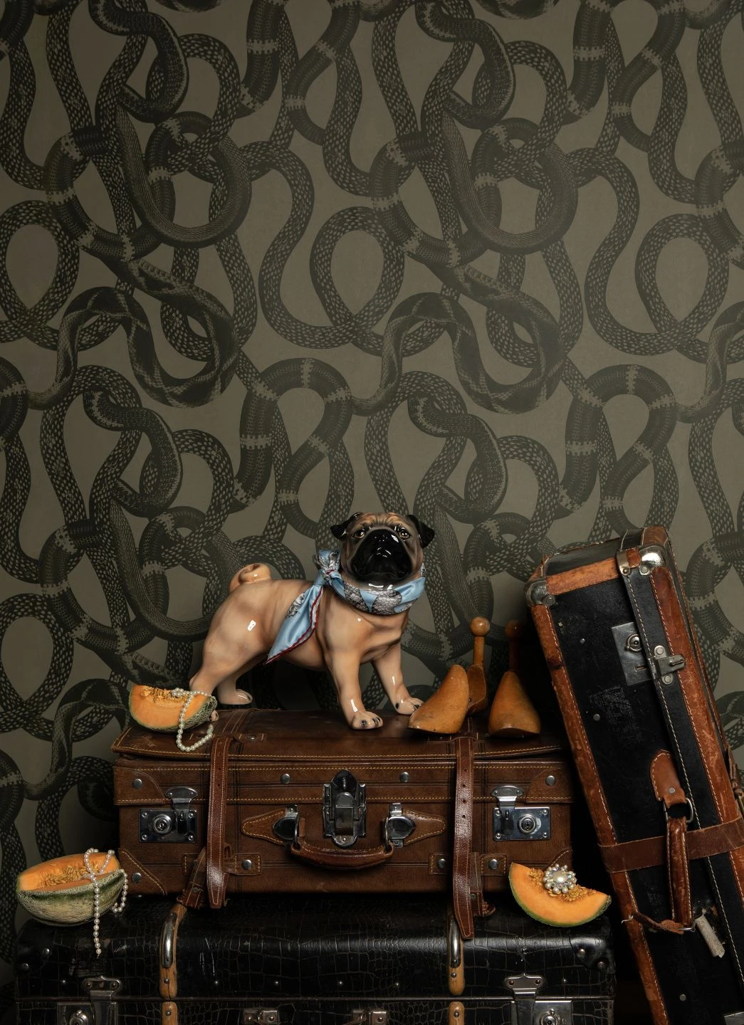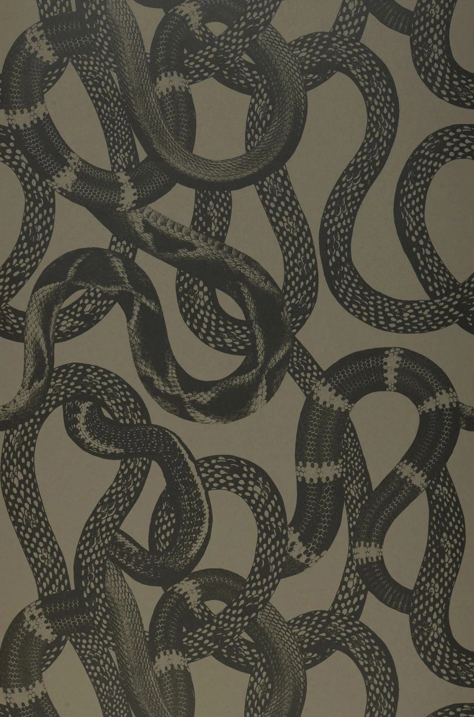 Schlangen in ihrer ganzen Faszination sind das Thema dieser Vliestapete der schwedischen Designerin Lisa Bengtsson. Die vielleicht am meisten verkannten Tiere schlängeln sich auf und ab an Ihren Wänden. Beinahe getarnt durch die schwarzen Illustrationen auf dem moosgrauen Grund, kommen dennoch die schuppige Struktur ihrer Haut und die unterschiedliche Zeichnung der Reptilien zum Ausdruck. Die ausgefallene Tapete verträgt Ton-in-Ton-Deko ebenso gut wie farbliche Elemente als Gegenpol.