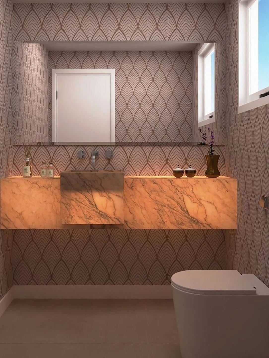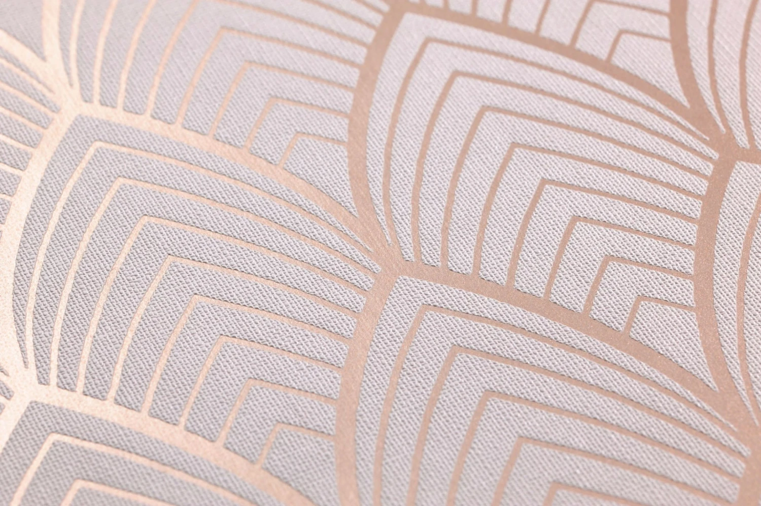 Symmetrie und klare Formen sind Merkmale des berühmten Art Deco. Besonders die Bogenform hat es dieser Kunstepoche angetan, wie Tapetenmodell Soana mit widerstandsfähiger Vinyloberfläche zeigt. Rosenholz und Zartrosa, verwöhnt von malerischem Glanz, bieten eine Farbbasis, die pudrigen romantischen und verträumten Einrichtungen gerecht wird.
