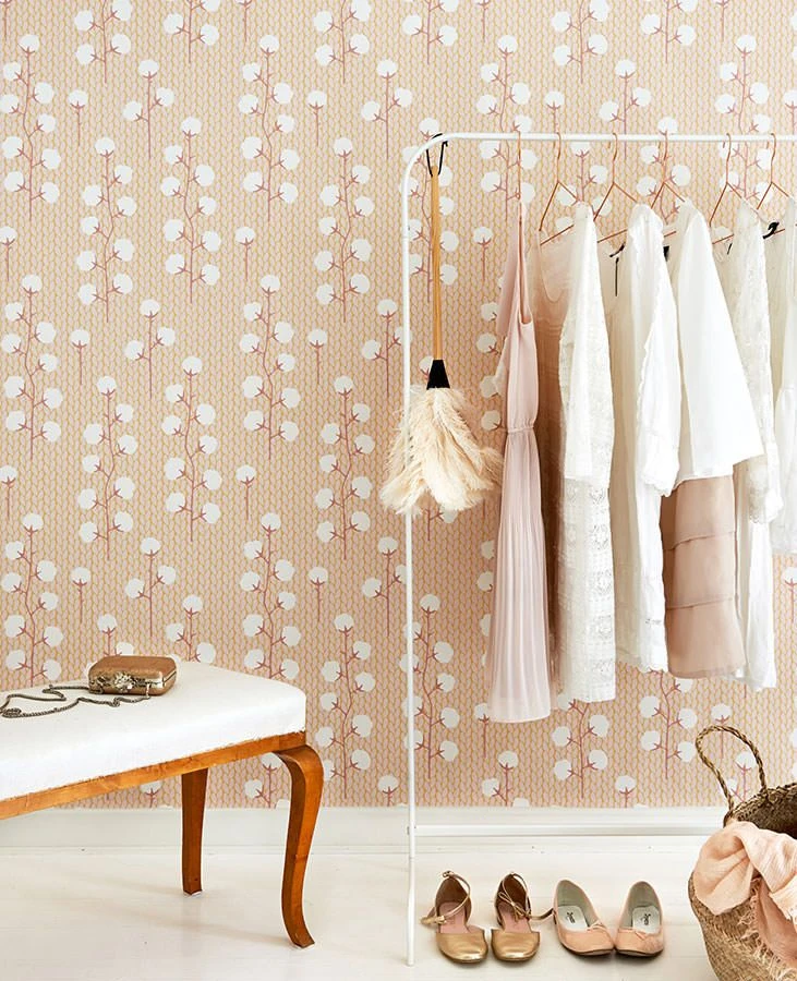 Die im Leimdruckverfahren hergestellte Tapete stammt von dem schwedischen Label Majvillan. Emporstrebende Baumwollpflanzen schmücken den Untergrund, der wie aus geflochtenen Zöpfen wirkt. Hier verbindet sich mattes Honiggelb mit Blassrosa, Braunrot und Cremeweiß.