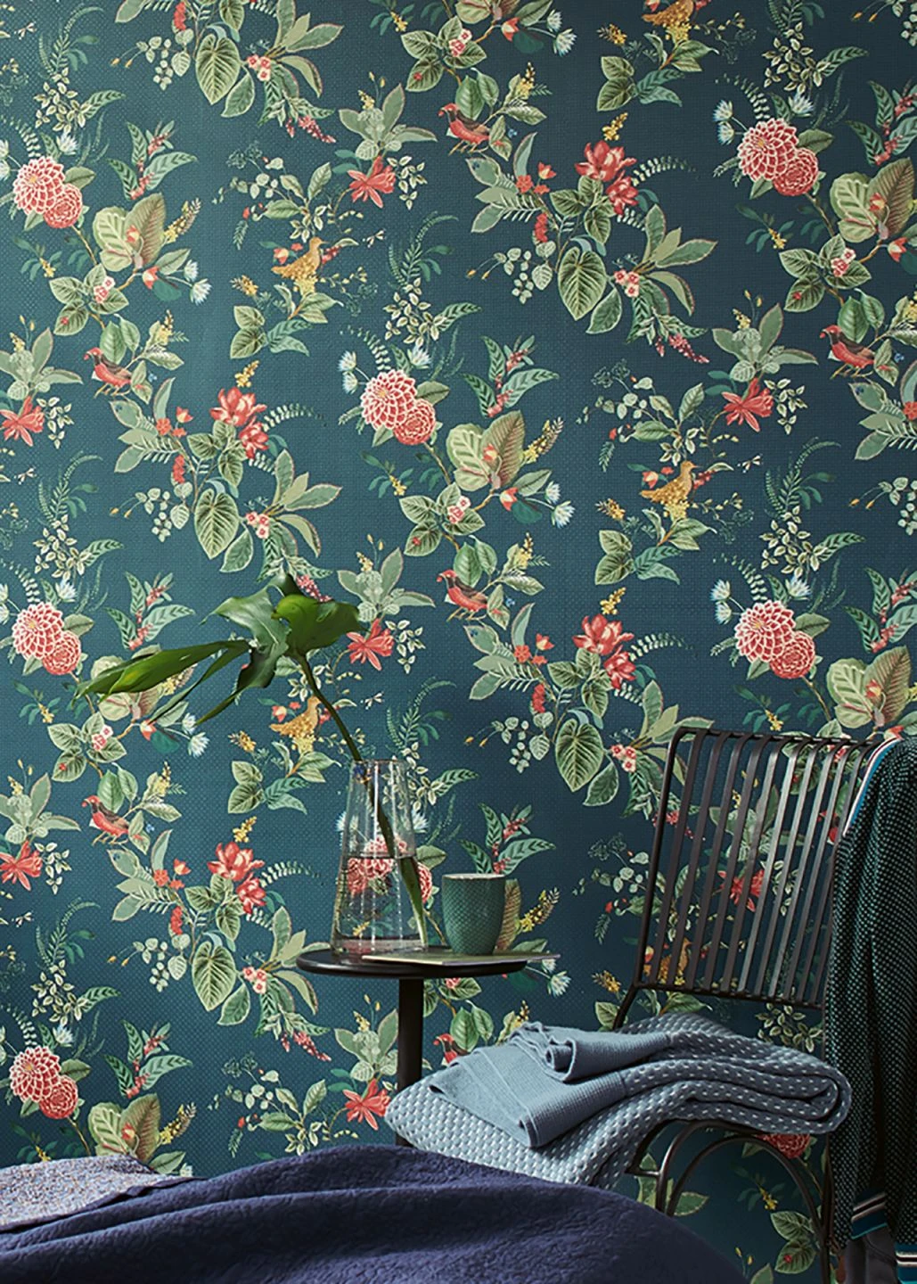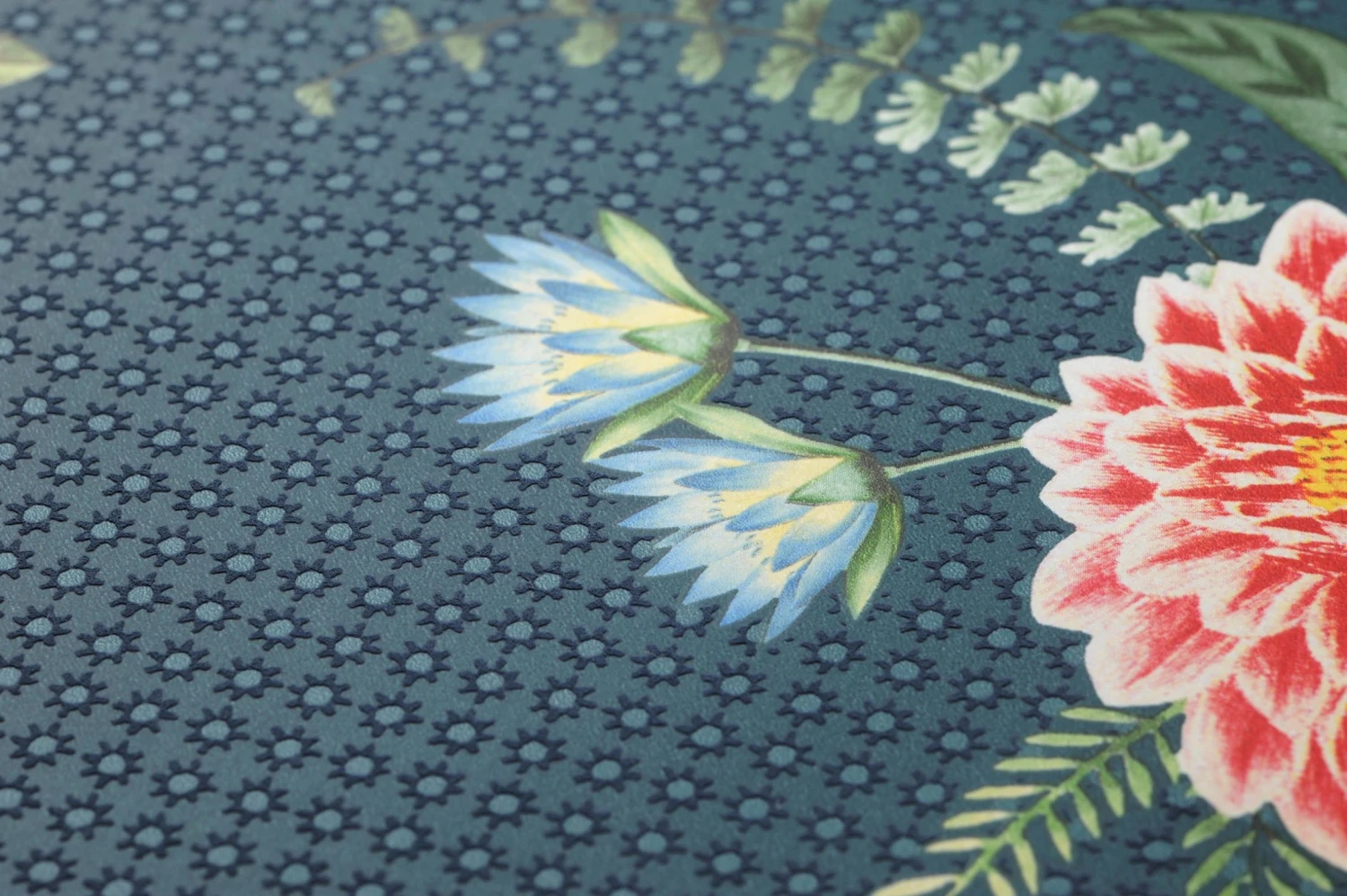 Edles Ozeanblau bildet den Hintergrund, vor dem sich farbenfrohe Blumen, exotische Blätter, Vögel und Insekten leuchtend abheben. Die Farbenpracht des detailgetreu abgebildeten bunten Lebens stellt einen reizvollen Kontrast zum ruhigen Blau dar. Ein weiteres Detail offenbart sich bei näherem Hinsehen: Die Oberfläche der Tapete ist mit einem leicht erhabenen, dezenten Blütenmuster gestaltet.