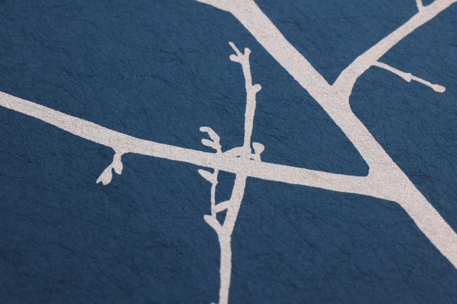 Die Zweige mit ihren feinen Verästelungen und Knospen schimmern leicht in Perlhellgrau auf dem ozeanblauen Grund, fast so, als würden sie vom blassen Licht des Mondes beschienen. Vliestapete Tabora strahlt eine friedliche Atmosphäre aus und schafft in Ihren vier Wänden eine Oase für einen gemütlichen Feierabend oder in Ihrem Schlafzimmer für eine erholsame Nacht. Der Kontrast zwischen den hellen Zweigen und dem tiefen Blau scheint die Fläche Ihrer Wand zu öffnen, als wäre dahinter der Abendhimmel.