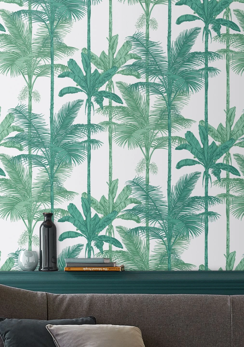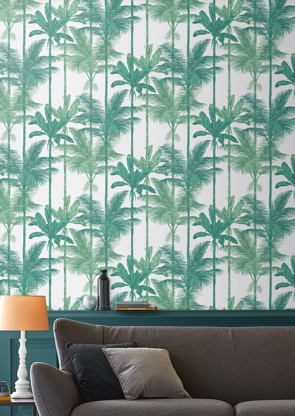 Palmen, die scheinbar an Lianen emporwachsen, zeigt die botanische Mustertapete Tamaris in dschungelreifen Grüntönen. Das raffinierte Liniendesign hat einen optisch streckenden Charakter und verleiht dem Muster aus unterschiedlichen Perspektiven spannende Wirkeffekte. Die leicht zu verarbeitenden Vliestapete verblüfft das Auge des Betrachters.