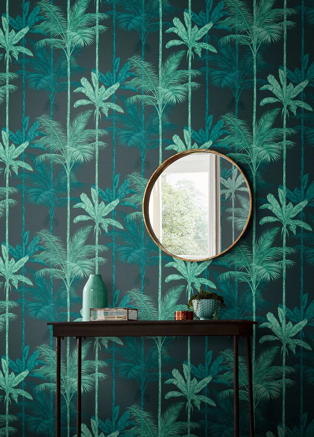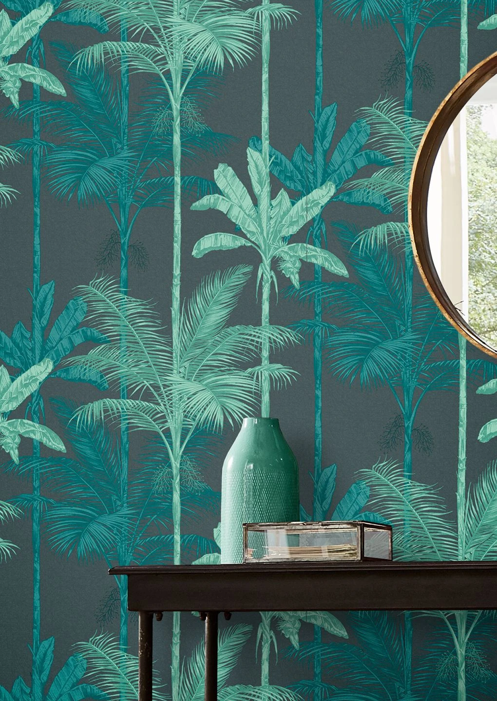 Freunde des Boheme-Stils kommen mit dieser schwarz-grünen Palmentapete auf ihre Kosten. Sinnliche Exotik bereichert Schlafzimmer, Wohnzimmer oder Badezimmer. Wie Perlen auf einer Kette reihen sich die Palmwedel auf und bilden so ein Muster, das aus nah und fern betrachtet abwechslungsreiche Perspektiven eröffnet.