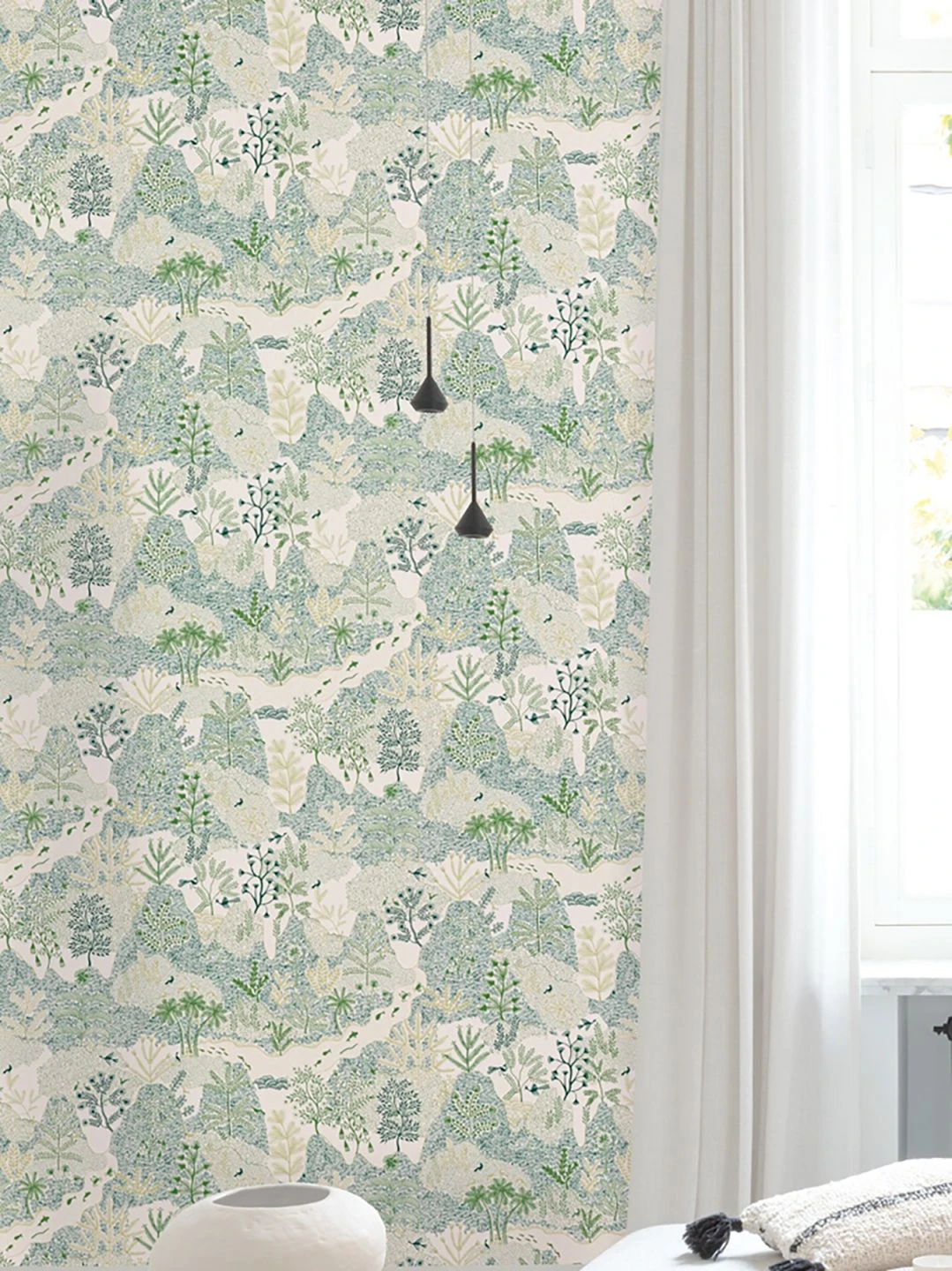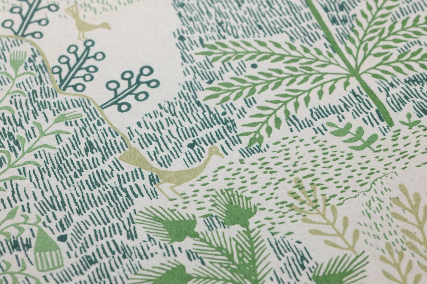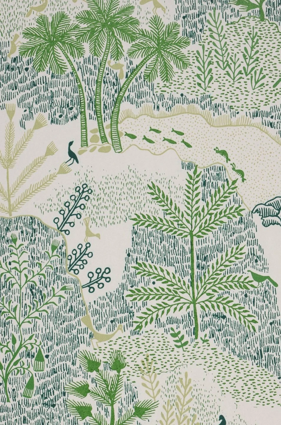 Erfrischend handgezeichnet wirkt die Illustration dieser Vliestapete: Wie mit ein paar Filzstiften in wenigen verschiedenen Farben skizziert, deuten Schraffuren eine tropische Landschaft an. Flüsse entspringen zwischen grasbewachsenen Hügeln, Palmen und andere Bäume wachsen an ihren Ufern, vereinzelt dazwischen Fische, Vögel und Krebse. Die Konzentration auf verschiedene Grüntöne auf dem weißen Hintergrund gibt der feinen Schraffur einen ästhetischen Zusammenhalt.