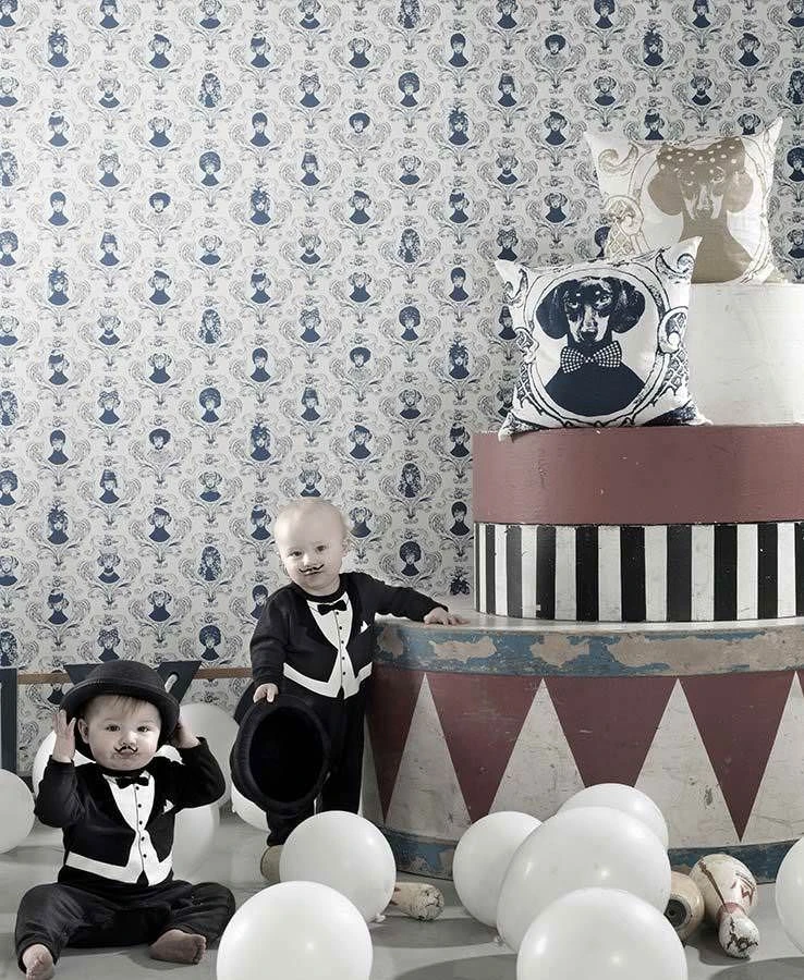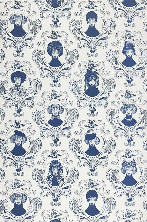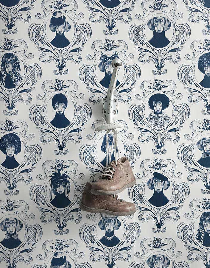 Des Menschen liebster Freund kommt auf der Design Tapete von Lisa Bengtsson im barockigen und humorvollen Stil zu ganz großen Ehren. Die unterschiedlichen, gewitzten Hundeporträts avancieren durch Kopfbedeckungen, Perücken und Accessoires zu tierisch guten Persönlichkeiten. Die Farbstellung blau-weiß verleiht der exklusiven Mustertapete einen edlen frischen Charakter.