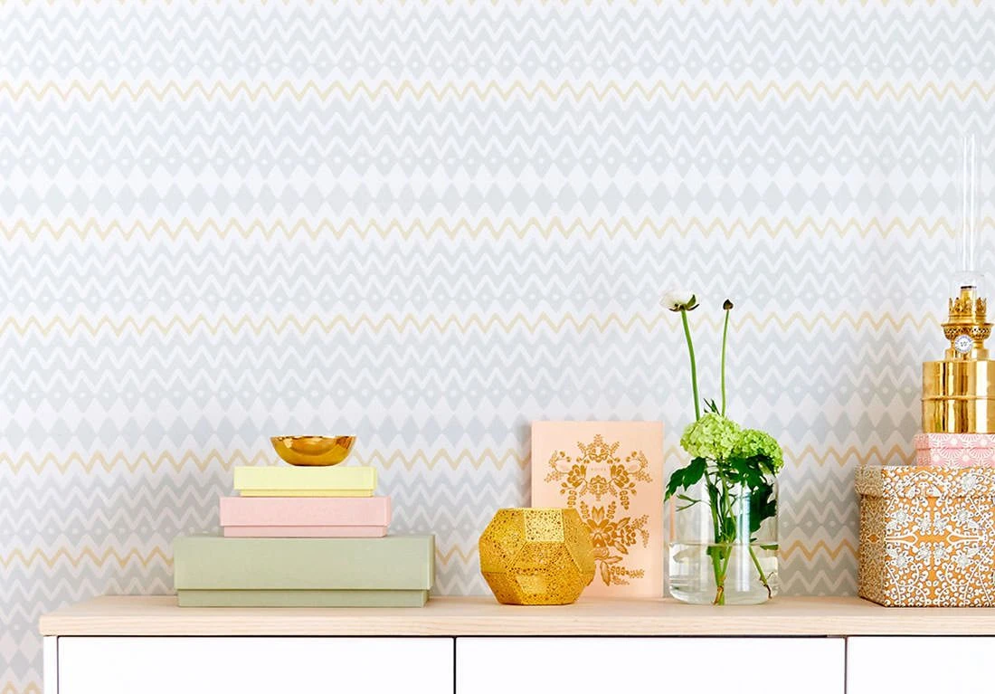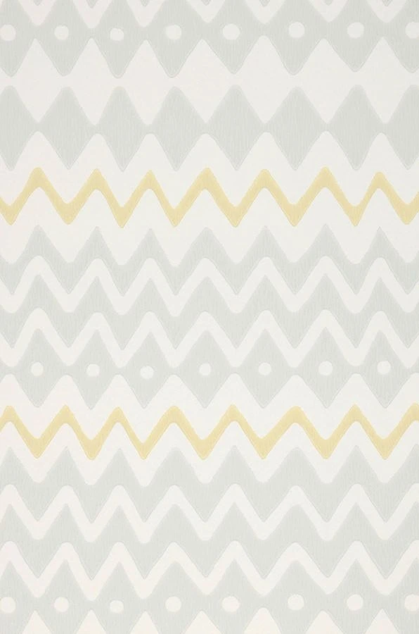Das Zickzack-Muster in dezenten Farben erinnert an indianische Kunstwerke. Durch das Leimdruckverfahren wirken die Linien in Hellgelb und Hellgrau wie von Hand bemalt.