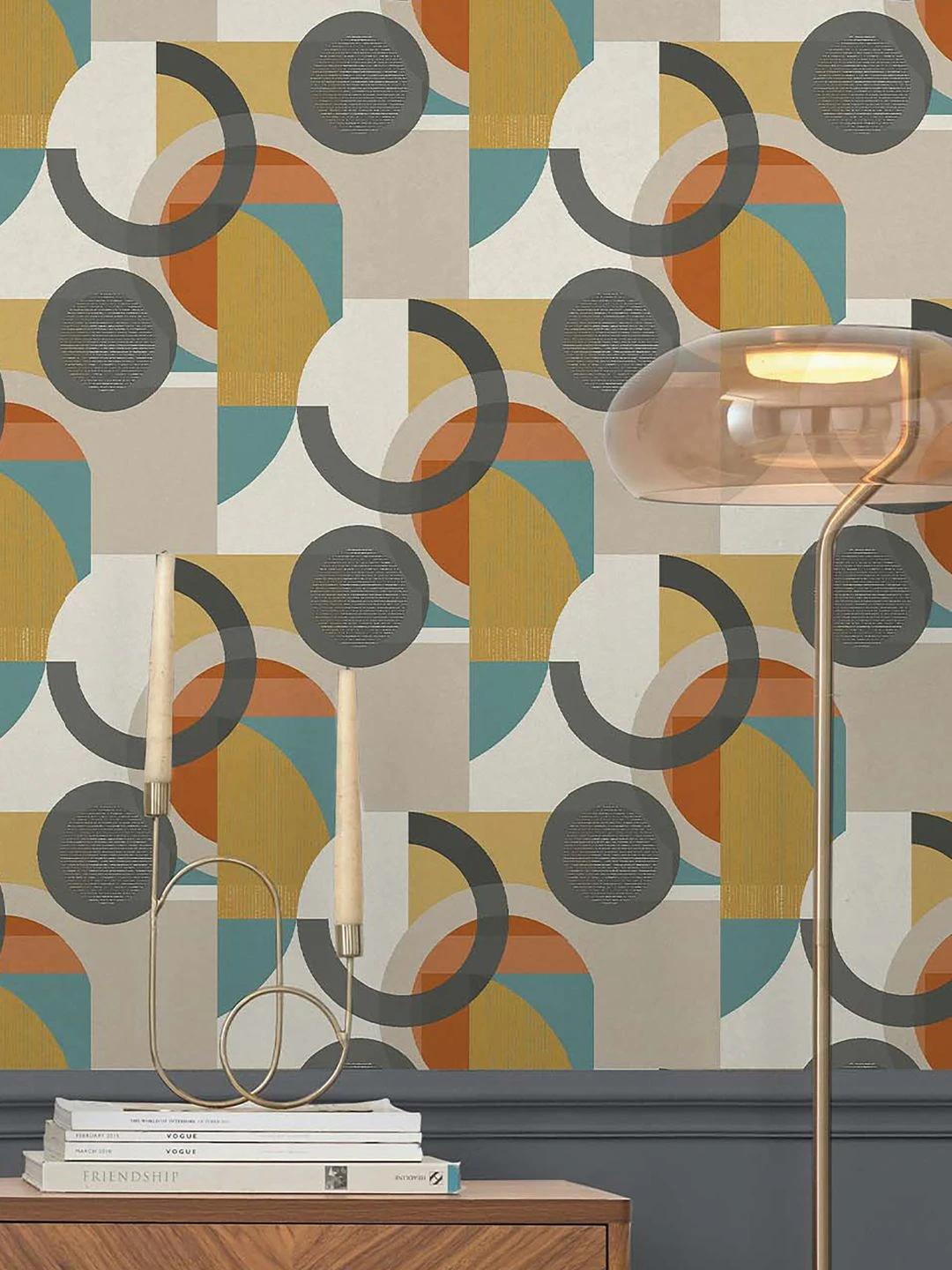 - MusterfarbeHellgraubeige, Ockergelb, Rotorange, Türkisblau, Umbragrau