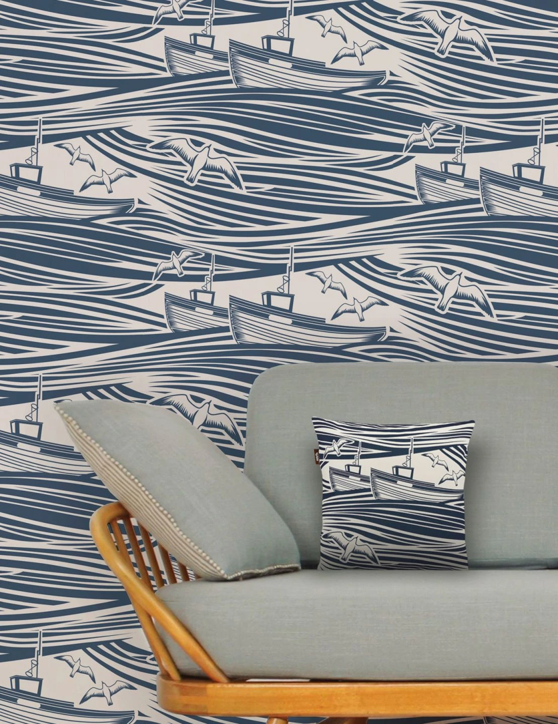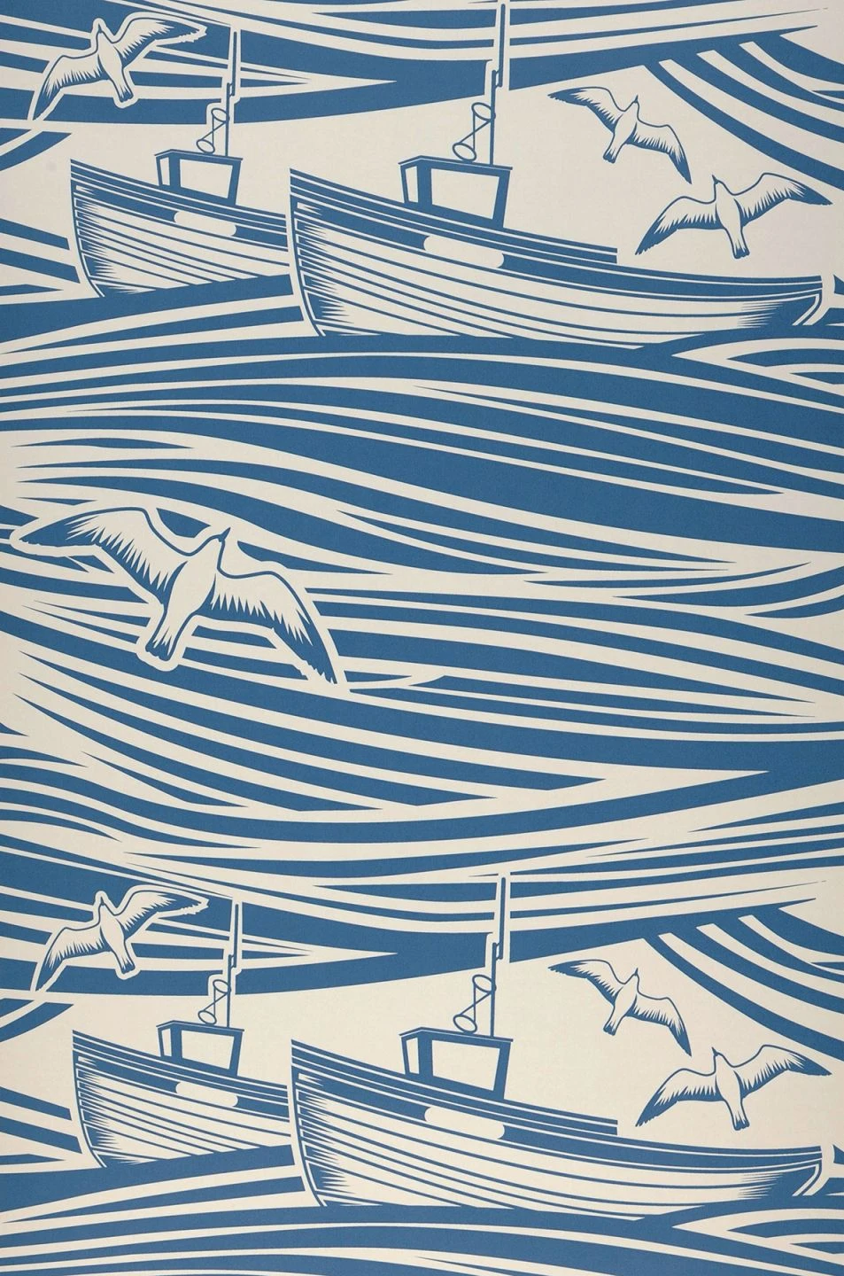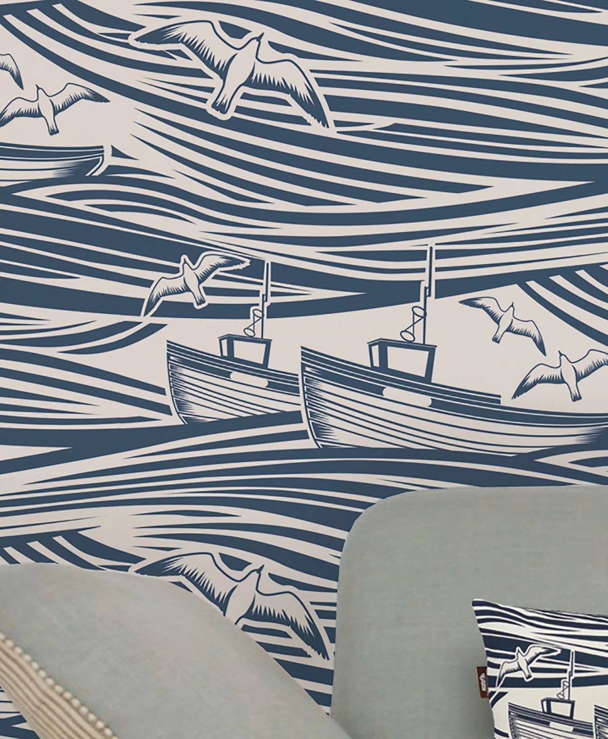 Designtapete Ulysses in Azurblau und Grauweiss versetzt sofort in die maritime Traumwelt. Unendliche Meeresweiten, Bootsabenteuer auf hoher See, perfekter Wellengang warten auf Sie. Die maritime Romantik Tapete besticht durch das außergewöhnliche Erscheinungsbild, das der Holz- bzw. Linolschnitt-Technik nachempfunden ist.