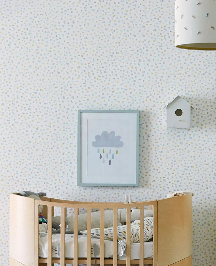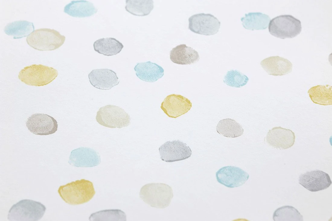 Wie mit einem Pinsel von Hand auf die Wand getupft wirken die unregelmäßig angeordneten Punkte in zartem Zitronengelb, Minttürkis und Beigetönen auf dem cremeweißen Grund der Papiertapete. Sie bringen frühlingshafte Leichtigkeit und Frische mit und schaffen eine sonnige Atmosphäre im Kinderzimmer. Mit weißen oder kiefernfarbenen Möbeln oder in Kombination mit einer der Musterfarben entsteht ein freundlicher, anregender Raum.