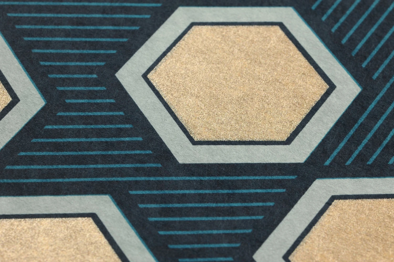 Klare Formen und starke Farben machen die geometrische Tapete Uroko zu einem charaktervollen Gesamtkunstwerk für Ihre Wand. Die Sechsecke in schimmerndem Gelbgold stehen im Mittelpunkt, umgeben von einem zartgrünen Rand und symmetrisch angeordnet auf einem schwarz und türkisblau schraffierten Grund. Die regelmäßige Anordnung des Musters schafft Struktur und Ordnung und betont den luxuriösen Glanz des Goldes.