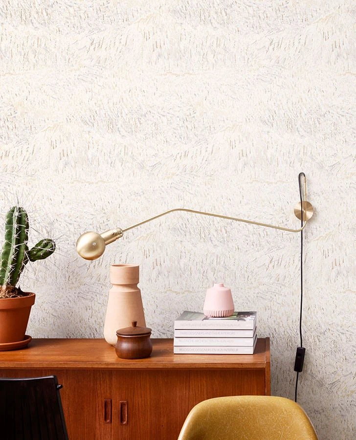 In Cremeweiß und zartem Blassviolett, Braunbeige und Violettblau empfindet die Vliestapete Vincent van Goghs Gemälde einer Sommerwiese nach. Die kraftvollen Pinselstriche machen die Gräser und Wiesenblumen im Oberflächenmaterial der Tapete wie in Ölfarbe auf einer Leinwand fühlbar. Die Oberfläche aus Vinyl ist hoch waschbeständig. Dadurch können Sie sich die sommerliche Stimmung von van Goghs Wiese sogar in Ihr Bad holen.