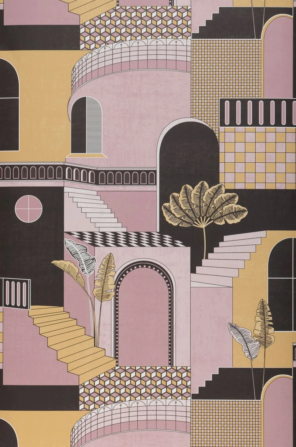 Märchenhaft orientalisches Flair zieht mit der Art-Deco-Papiertapete Verney bei Ihnen ein. Aus geometrischen Formen setzt sich eine Stadt zusammen, komplett mit Häusern und Torbögen, Treppen, Fenstern und Balkonen. Die Rosa- und Sandgelbtöne in Verbindung mit Schwarz und Weiß bilden eine Vielfalt von Kachelmustern, die die einzelnen Häuser voneinander unterscheiden. Wenn Sie die Themenwelt Orient in Ihrer Einrichtung aufgreifen, schaffen Sie ein stimmiges und stimmungsvolles Ambiente.