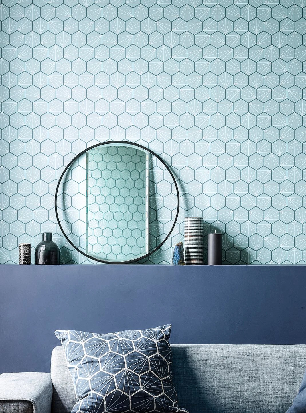 Geordnet, aber gleichzeitig lebendig wirkt das geometrische Muster dieser Vliestapete. Dicht an dicht wie Waben nutzen Sechsecke die vorhandene Fläche perfekt aus. Umrandet von graublauen Fugen und in sich strukturiert durch grauweiße, von einem Punkt ausgehende Strahlen, erzeugen die mintgrauen Sechsecke wie Kacheln eine ruhige, kühle Gelassenheit. Helle Farben und Holzmöbel oder Blautöne ergeben ein tolles Gesamtbild.