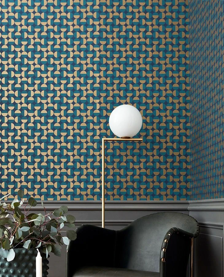 Halb wasserblau, halb perlgolden sind die Kreise, die das geometrische Muster der Vliestapete „Wahida“ ausmachen. Ein harmonisches Gesamtbild ergibt sich mit dem ruhigen, graublauen Untergrund, von dem sich das Perlgold mit seinem attraktiven Schimmer wunderbar abhebt. Ihre Wände werden abstrakt, aber wirkungsvoll belebt mit einem leichten Retro-Look, den Sie mit den passenden Möbeln unterstützen können.