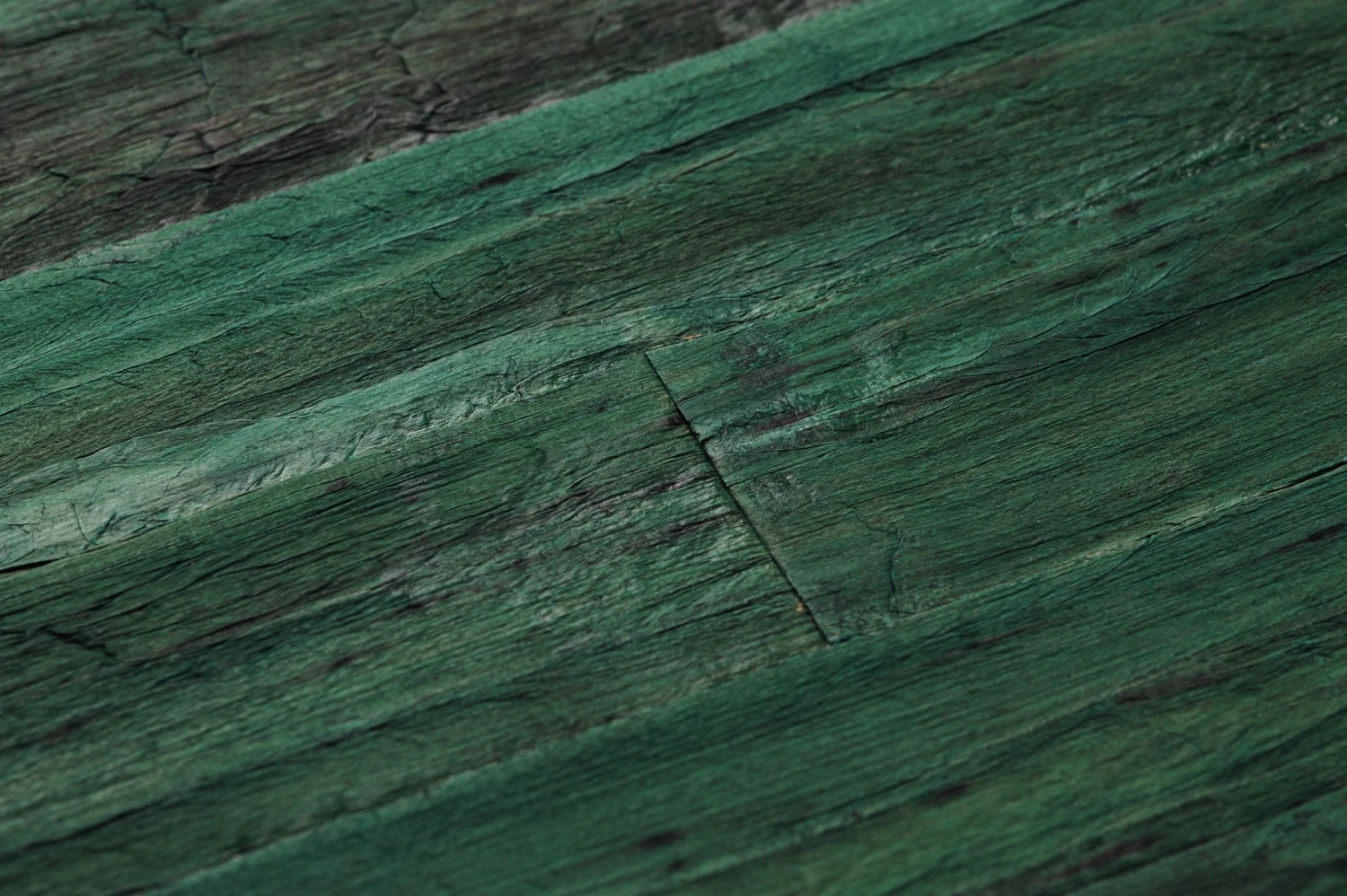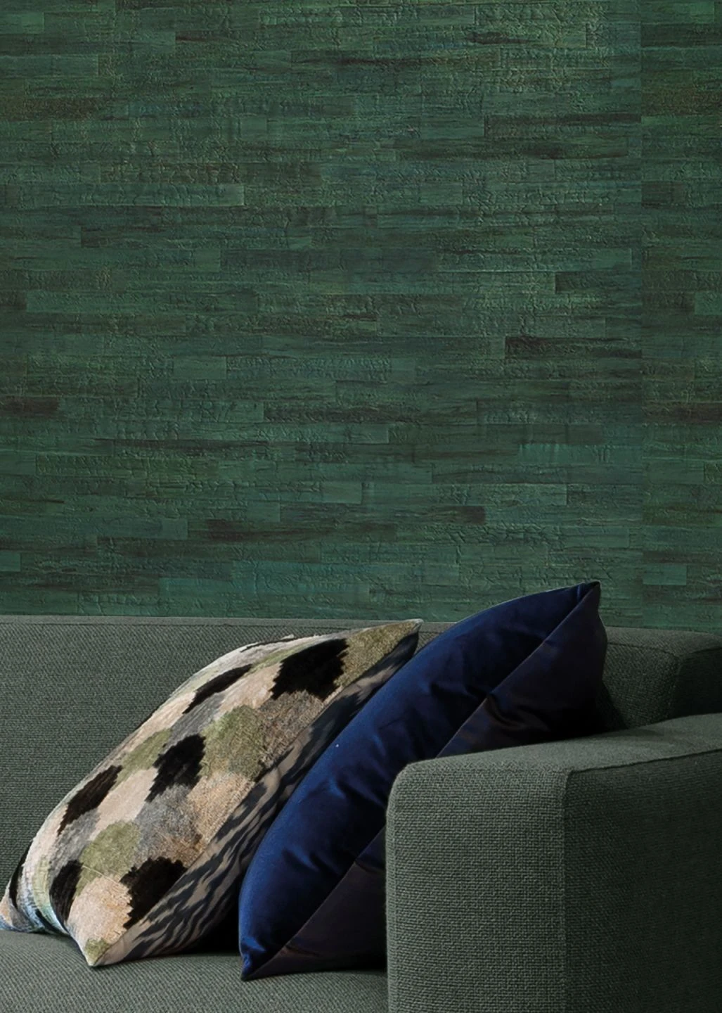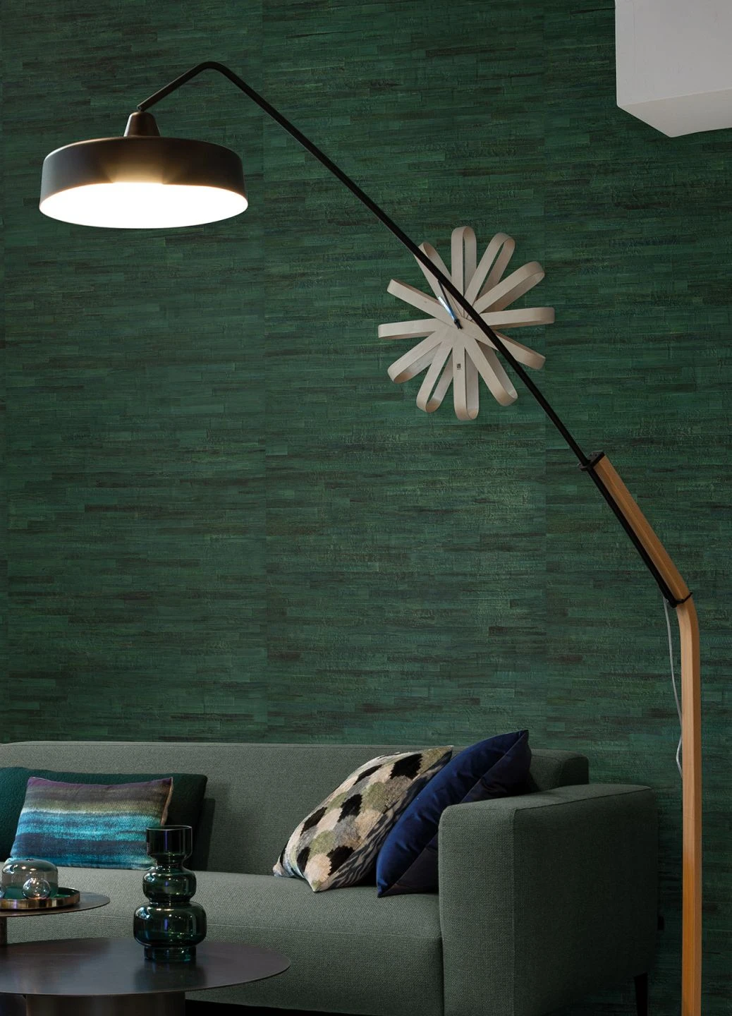 Das Oberflächenmaterial dieser Vliestapete ist ein echtes Naturprodukt: Getrocknete Pflanzenteile der Wasserhyazinthe schaffen ein ganz besonderes Raumklima. Die natürliche Maserung des Materials lässt die Grüntöne, die zur Färbung verwendet wurden, besonders schön und lebendig zur Geltung kommen. Die Haptik der Oberfläche erinnert mit ihrer feinen Struktur an Holz.