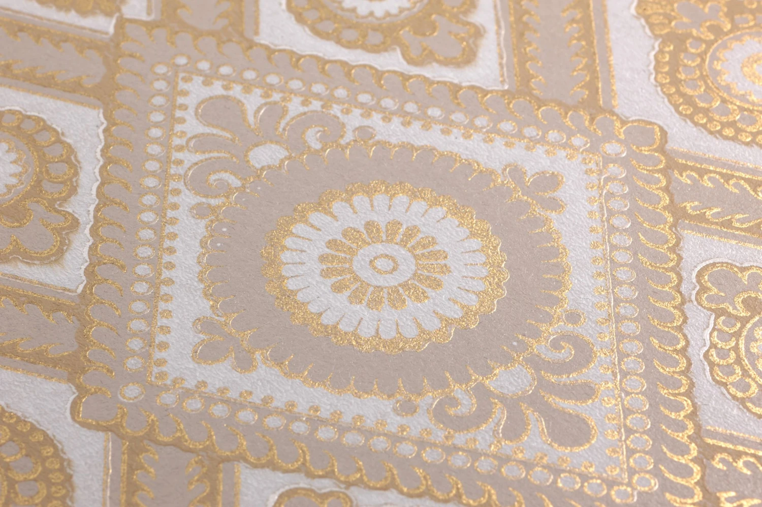 Das Wechselspiel von Licht und Schatten, Tiefe und Ebenen ist für Klassiktapete William Ehrensache. Der raffinierte Farbenmix aus Weiß, Currygelb, Hellbeigegrau und Gold Schimmer verbindet feine Eleganz mit einer sehr modernen Gesamtwirkung. Kombinieren Sie dazu Einrichtungsgegenstände aus Metall und Messing und mit haptisch interessanten Stoffen.