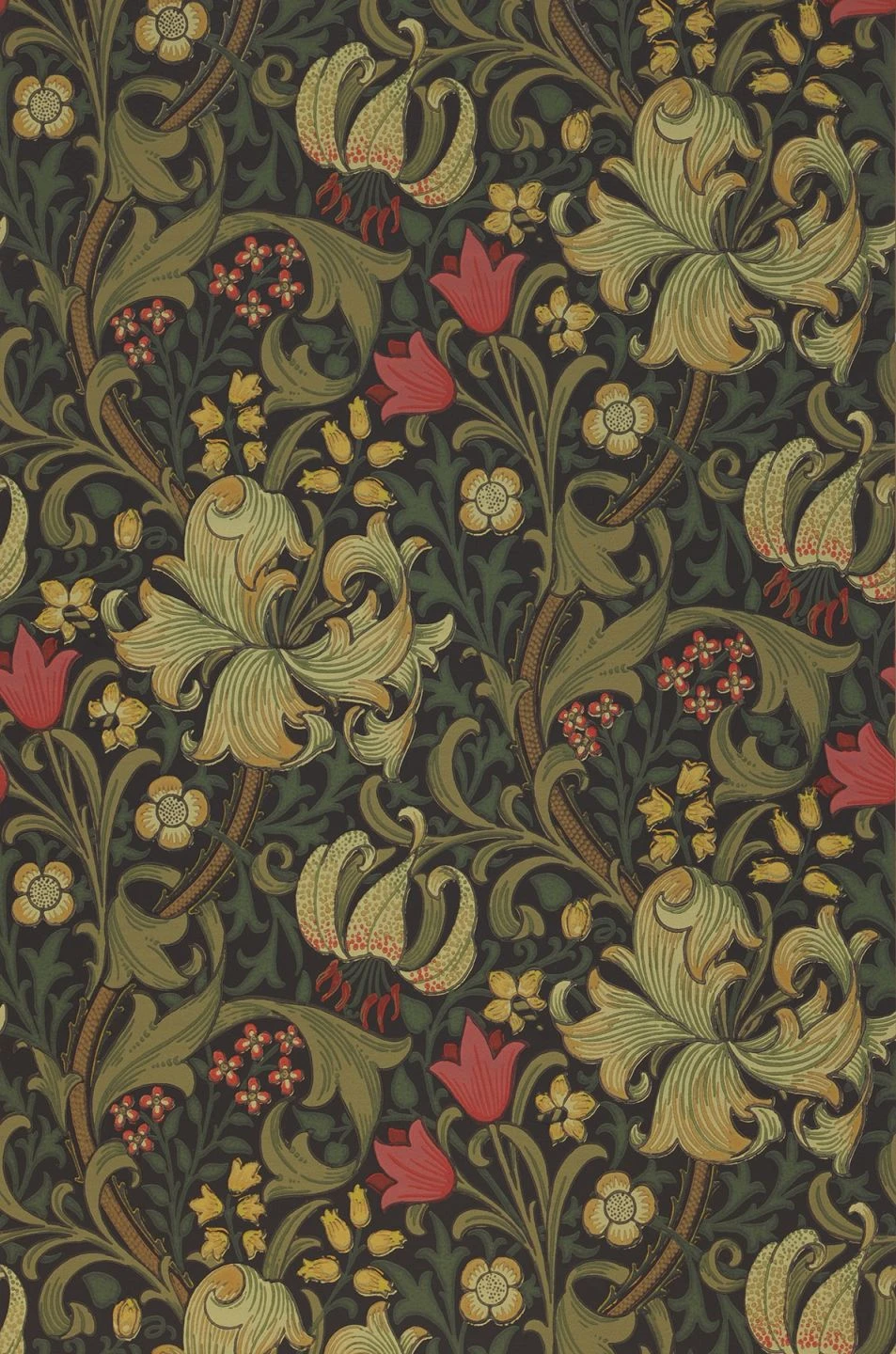 Kräftige Farben wie auf einem Wandteppich dominieren die im Leimdruckverfahren hergestellte Papiertapete, deren Entwurf seinen Ursprung im 19. Jahrhundert hat. Das klassische Design aus dem Hause Morris & Co. zeigt ineinander verschlungene Ranken und eine Vielzahl verschiedener Blüten. Im Mittelpunkt stehen große, üppig geformten Lilien mit ihren charakteristischen Staubgefäßen. Die stilisierten Blumen bedecken die gesamte Fläche der Tapete auf dem schwarzgrauen Grund.
