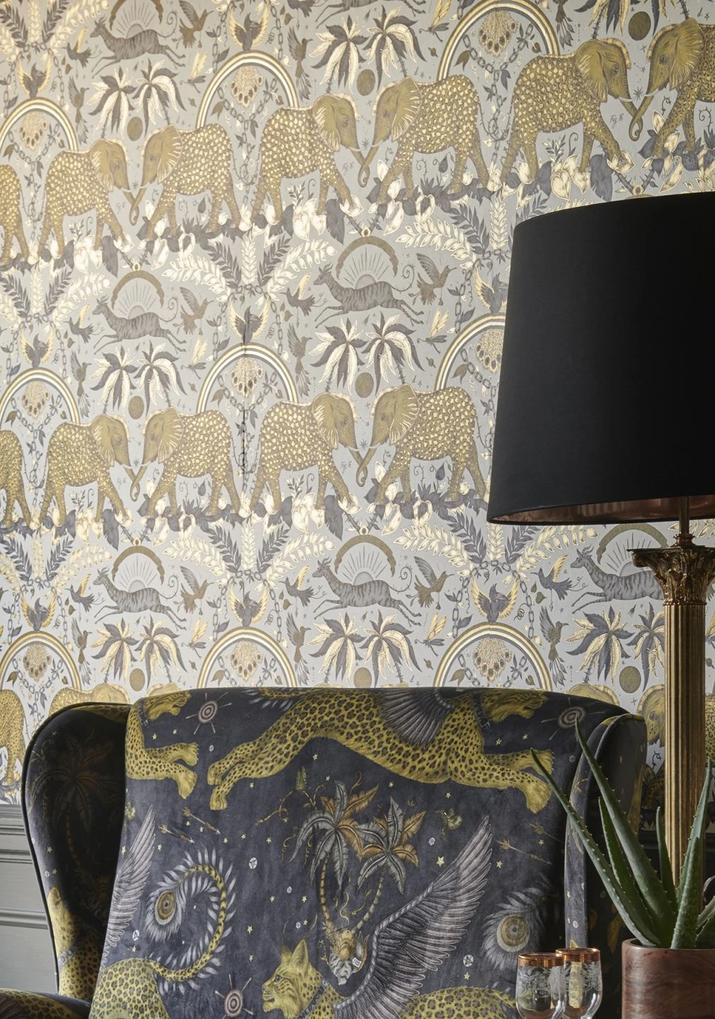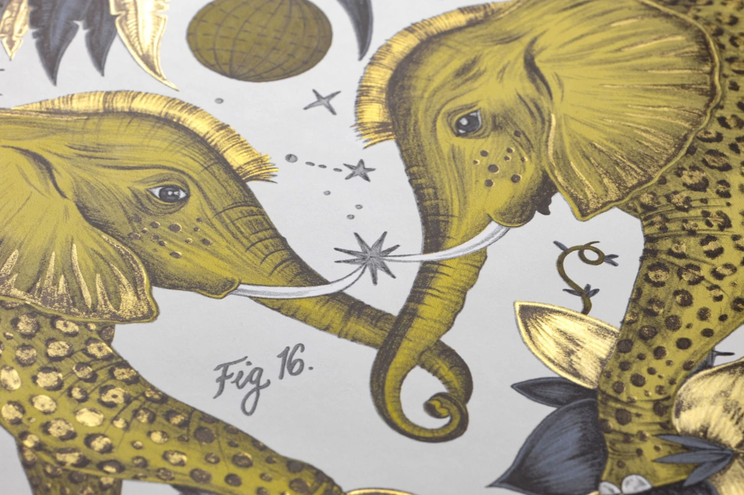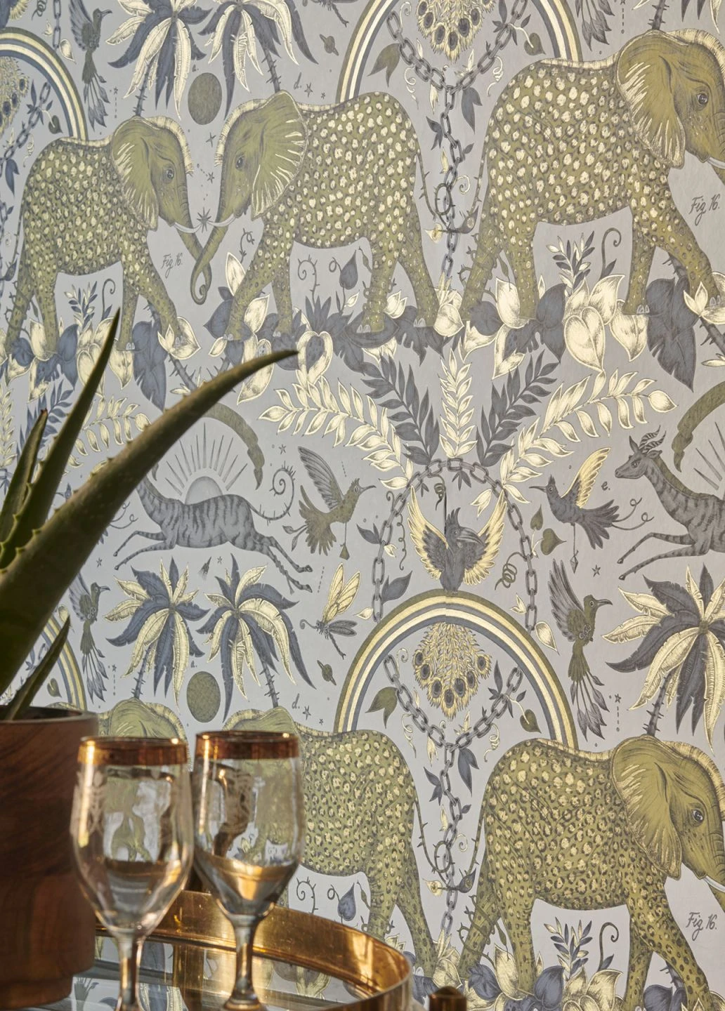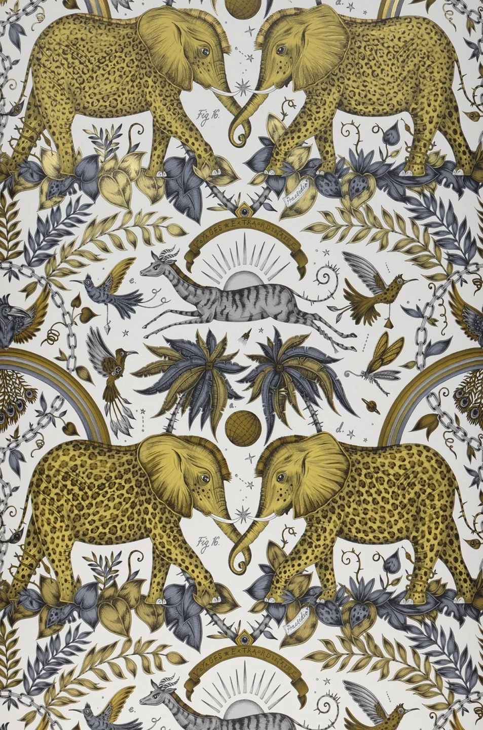 Elefanten mit Leopardenmuster und Mähne, springende Antilopen mit langem Ringelschwanz, prachtvolle Vögel und Insekten – eine phantastische Tierwelt entfaltet sich auf dieser Vliestapete zwischen Blumenranken, Palmen und Sonnen. Das Design in Blassgelb und Grautönen gewinnt strahlende Akzente durch Elemente in Mattgold. Mit der außergewöhnlichen Tapete gestalten Sie Ihren Raum individuell und unverwechselbar. (Kathmandu)