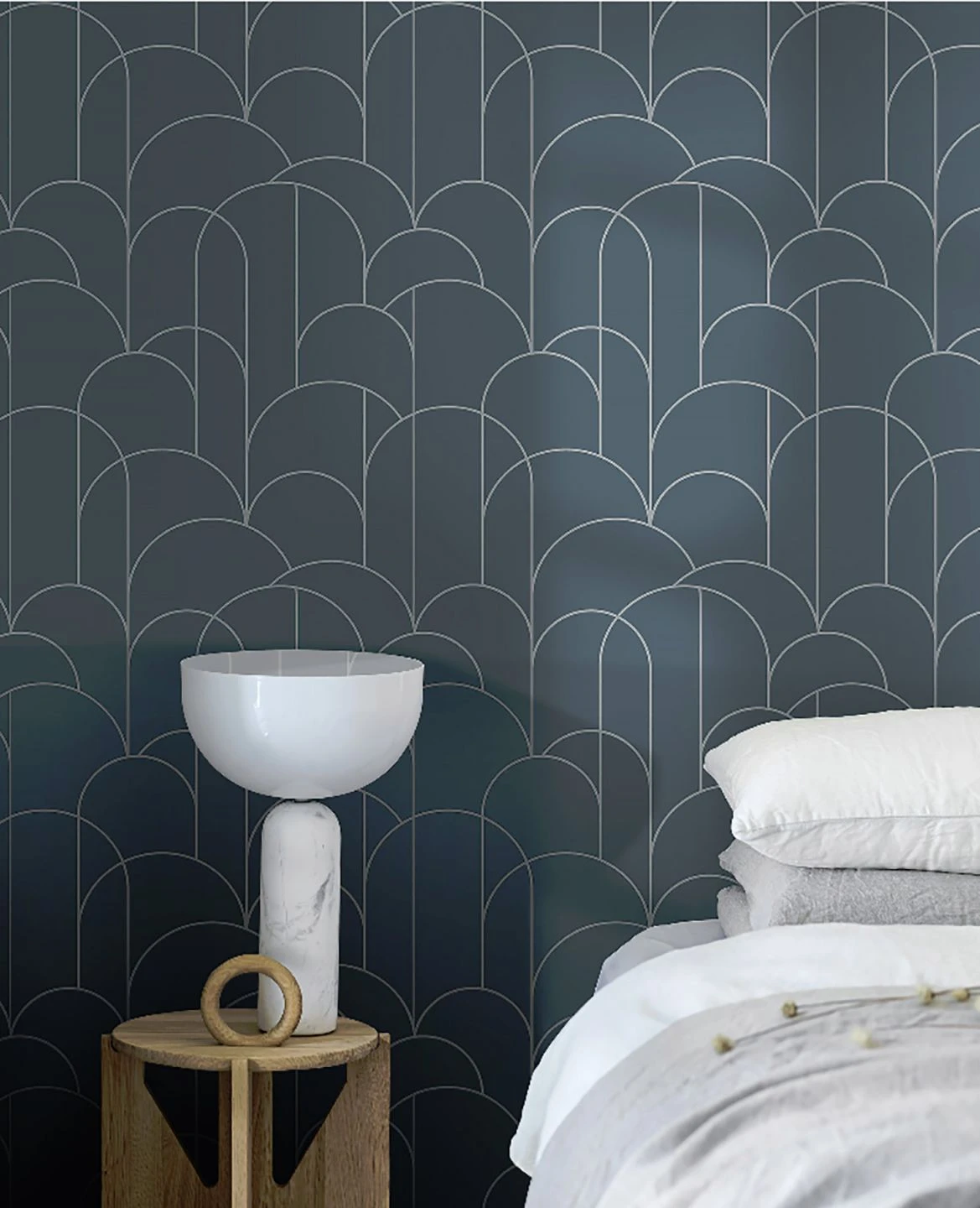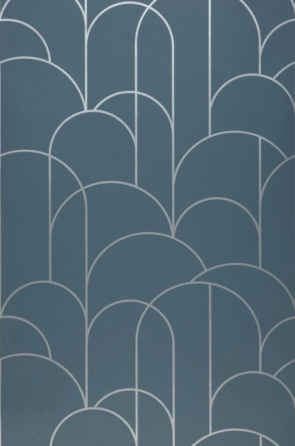 Ein ruhiges, mattes Blaugrau bildet den Hintergrund für fein umrandete, symmetrische Bögen im leicht schimmernden Farbton von Weißaluminium. Die filigranen Umrisse der Bögen beleben den dunklen Grund der Tapete auf elegante Weise ganz im Stil des Art Deco. Helle, weiße oder metallfarbene Möbel im Vintage-Look sind eine schöne Entsprechung für die hochwertige Vliestapete.