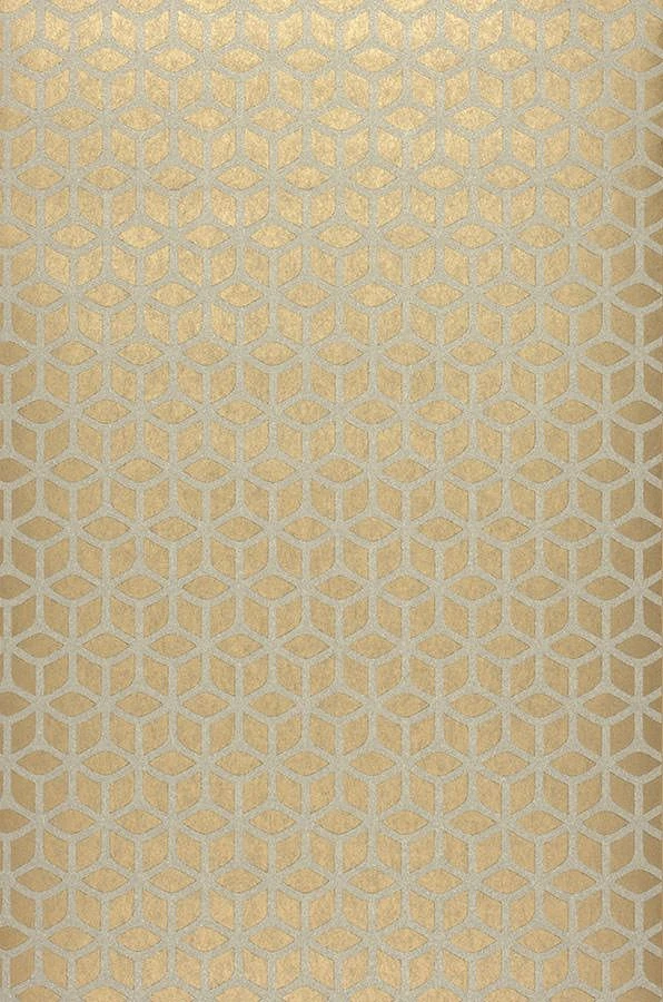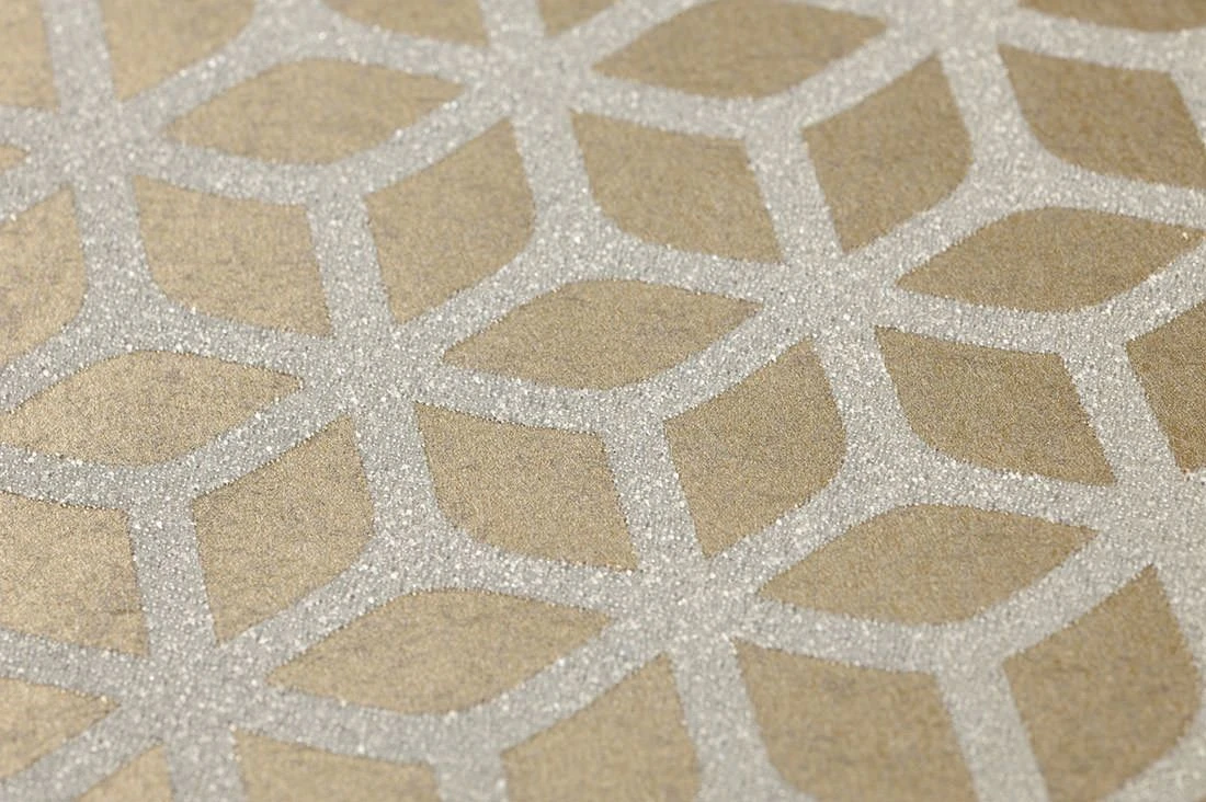 Das Muster aus Glasperlen dieser goldenen Tapete ist den Bienenwaben nachempfunden. Die Perlen schimmern Weiß-Silber und zaubern ein ausdrucksvolles Ambiente.