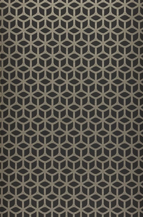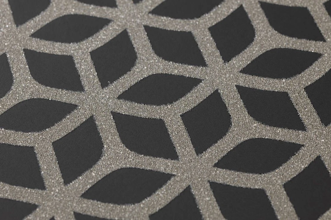 Das Muster aus Glasperlen dieser schwarzen Tapete ist den Bienenwaben nachempfunden. Die Perlen schimmern Silbergrau und zaubern ein ausdrucksvolles Ambiente.