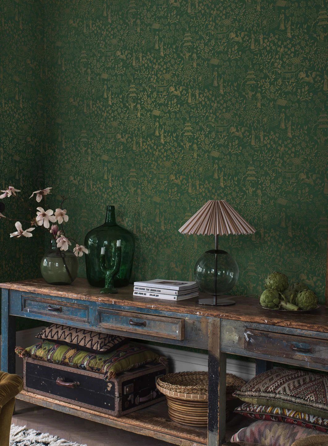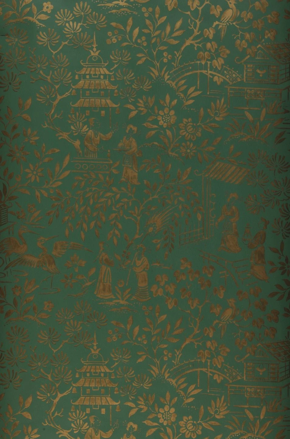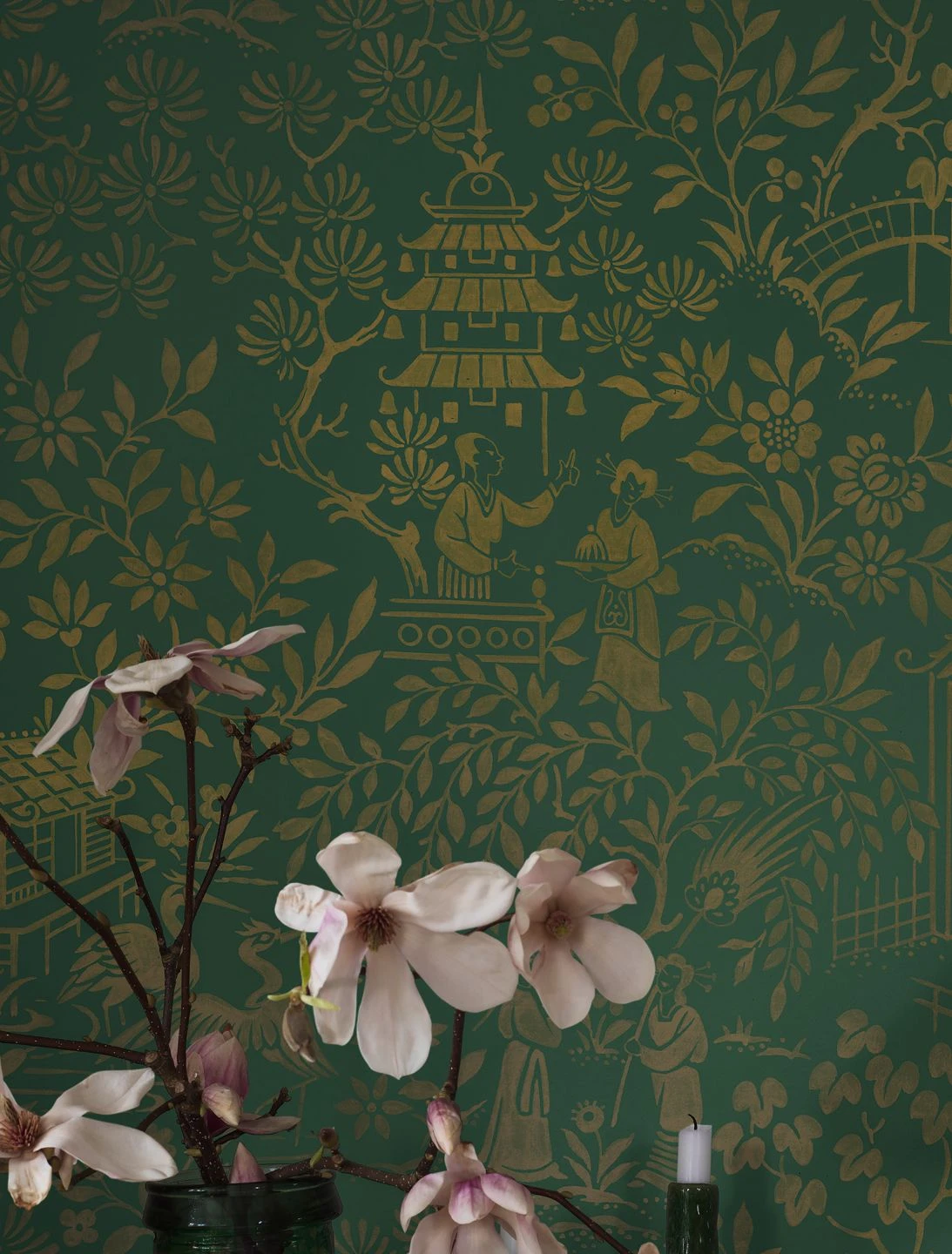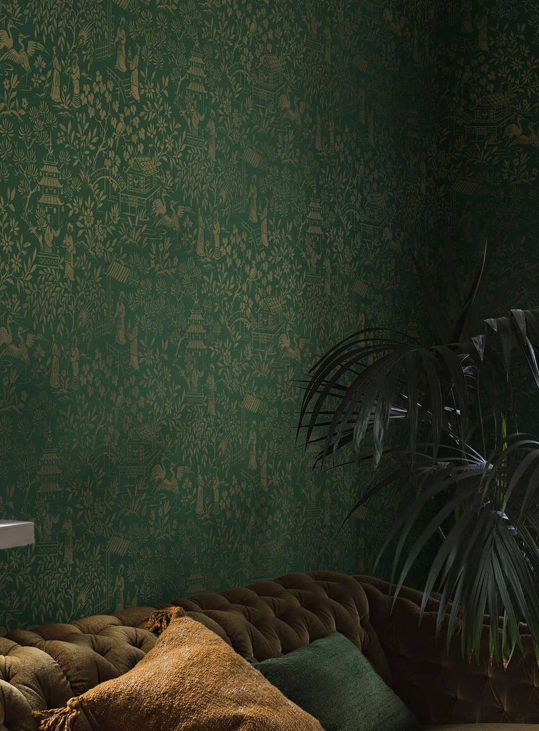 In schlichten, flächigen Formen, wie mit einem Stempel auf den patinagrünen Grund aufgebracht, schaffen stilisierte Szenen einer Parklandschaft voller Tempel, Brücken und Kraniche, dazwischen einige menschliche Figuren, ein fernöstliches Ambiente. Die Kombination des golden schimmernden Musters und des dunklen Grün machen Vliestapete Zen Garden zu einer zeitlos kostbar wirkenden Kulisse für Ihre Einrichtung im orientalischen Stil.