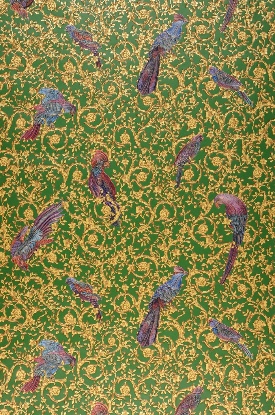 Versace entwirft mit diesem entzückenden Tapetendesign eine neobarocke Offenbarung an die Vogelwelt. Braun und Hellgelb verleihen den Ranken-Ornamenten zarten Goldschimmer, der die violetten Paradiesvögel einfängt. Der grüne Fond setzt einen markanten Kontrast. Die edle Designertapete mit fühlbarem Relief besitzt eine strapazierfähige und scheuerbeständige Vinyloberfläche.