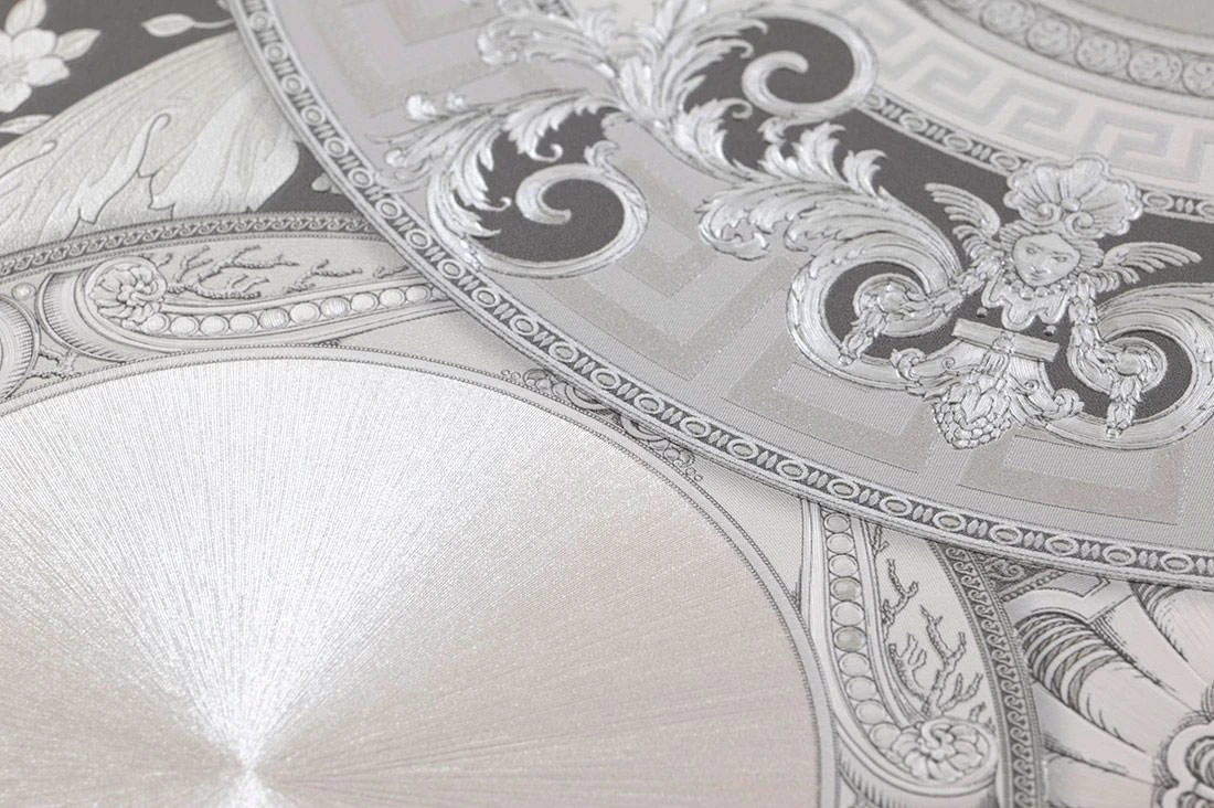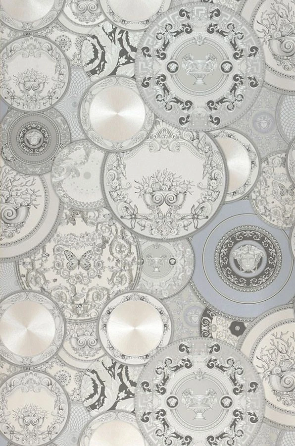 Versace versteht es geschickt, Elemente aus dem historischen und prachtvollen Kontext in ein modernes Kunstwerk zu verwandeln. Luxustapete Noell besticht durch eine Vielzahl von kunstvoll bemalten Teller-Kreisen, die im Gesamtbild zu einem hochdekorierten kosmischen Silber-Universum avancieren. Die abgestimmte Farbtextur von schimmerndem Cremeweiss und Hellgrau mit Umbragrau verleiht der Fantasie zusätzlich Flügel.