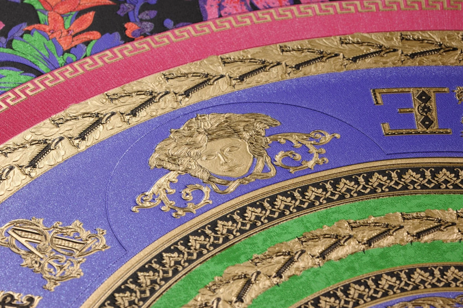 Ein Feuerwerk von Farben, leicht schimmernd und voller goldener Details, macht Ihre Wand zu einem lebhaften Kunstwerk aus barocken und antiken Formen und Mustern. Die kreisrunden, antik anmutenden Ornamente sind von einer Fülle stilisierter Blätter und Blüten umgeben, die ihren Ursprung in der barocken Tapete haben. Falls Sie jemals geglaubt haben, barocke Tapeten seien langweilig, belehrt Venus Sie schnell eines Besseren!