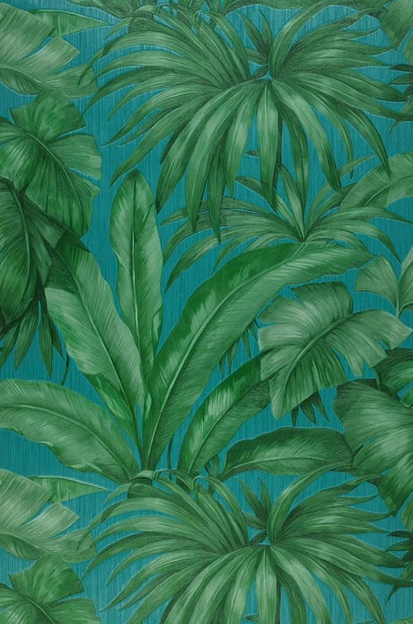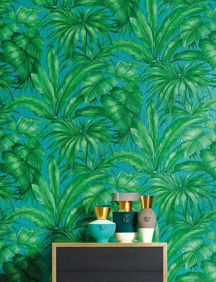 Eine perfekte Gratwanderung zwischen Realismus und Stilisierung ist Versace mit dieser Designertapete gelungen. Die üppigen Palmenblätter in helleren und dunkleren Grüntönen sind detailgetreu gezeichnet und erhalten durch das feine, fühlbare Relief der Vinyloberfläche zusätzliche Authentizität. Gleichzeitig erhält der Verzicht auf die Darstellung von Stämmen und Zweigen und die Anordnung der Blätter die Stilisierung aufrecht. Auch Ihr Badezimmer können Sie mit dieser scheuerbeständigen Tapete in eine grüne Oase verwandeln.
