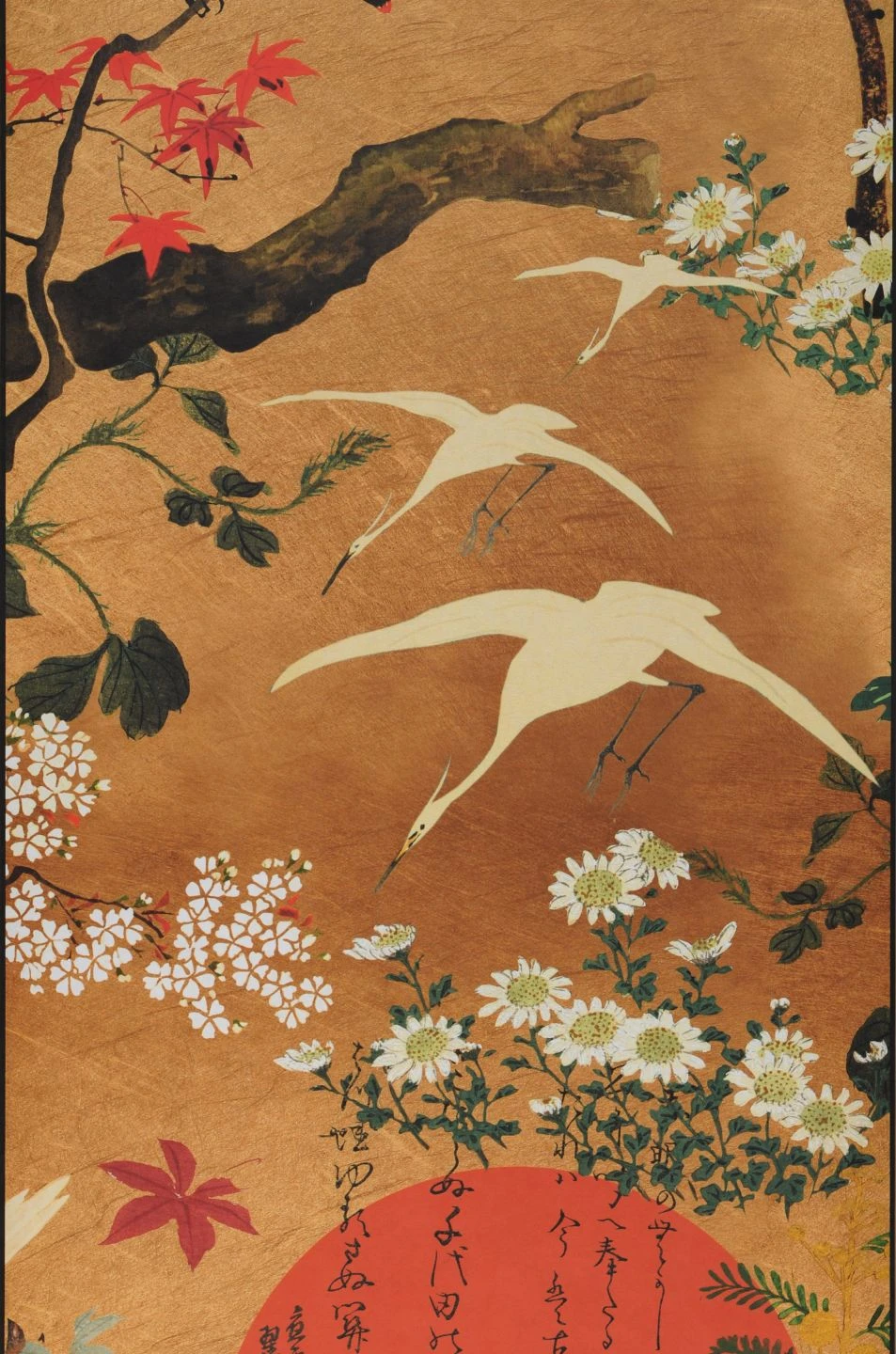 - DesignAsiatische Schriftzeichen, Kraniche, Sonne, Vögel, Zweige mit Blättern u. Blüten