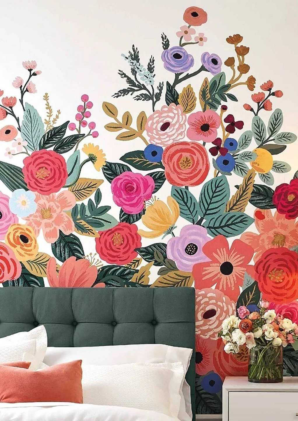 Die ganze Farbenpracht einer blühenden Sommerwiese bringt dieses zweiteilige Wandbild nach einem handgemalten Entwurf aus dem Hause Rifle Paper in Ihren Raum. Blüten in leuchtenden Rot-, Rosa-, Blau- und Gelbtönen zwischen Blättern in satten Schattierungen von Grün leuchten aus dem weißen Untergrund heraus. Wie in einem kunstvollen Blumenarrangement verjüngen sich die Zweige und Blüten nach oben hin und sorgen für eine wirkungsvolle Raumaufteilung in der Höhe.